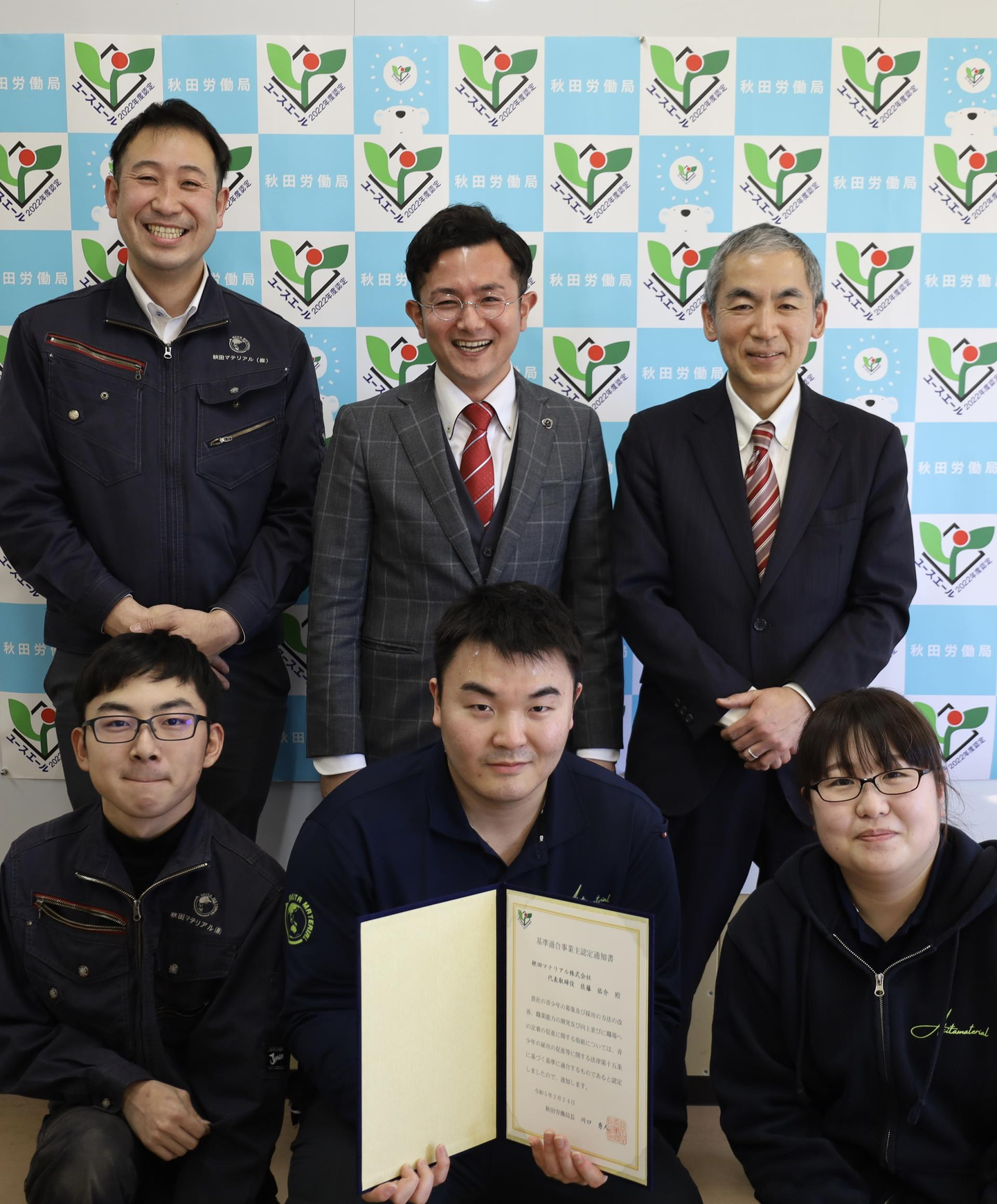 申請にあたって条件が様々あり、弊社も取得までに2年かかりました。先日、秋田県労働局長 川口様をはじめ、多くの皆様にご参加いただき、認定通知書交付式を開催しました。