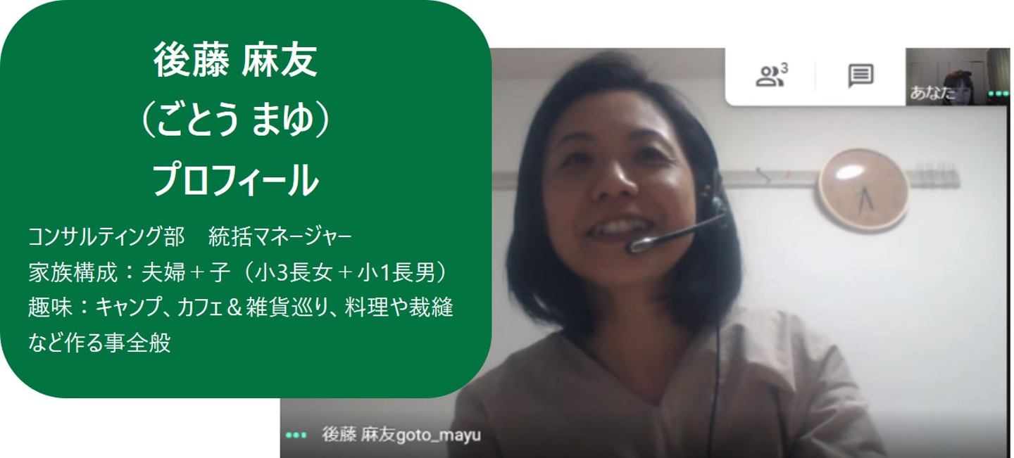 2度の産休・育休を取得後、管理職として活躍し続けているコンサルティング部 統括マネージャー・後藤麻友さんの声