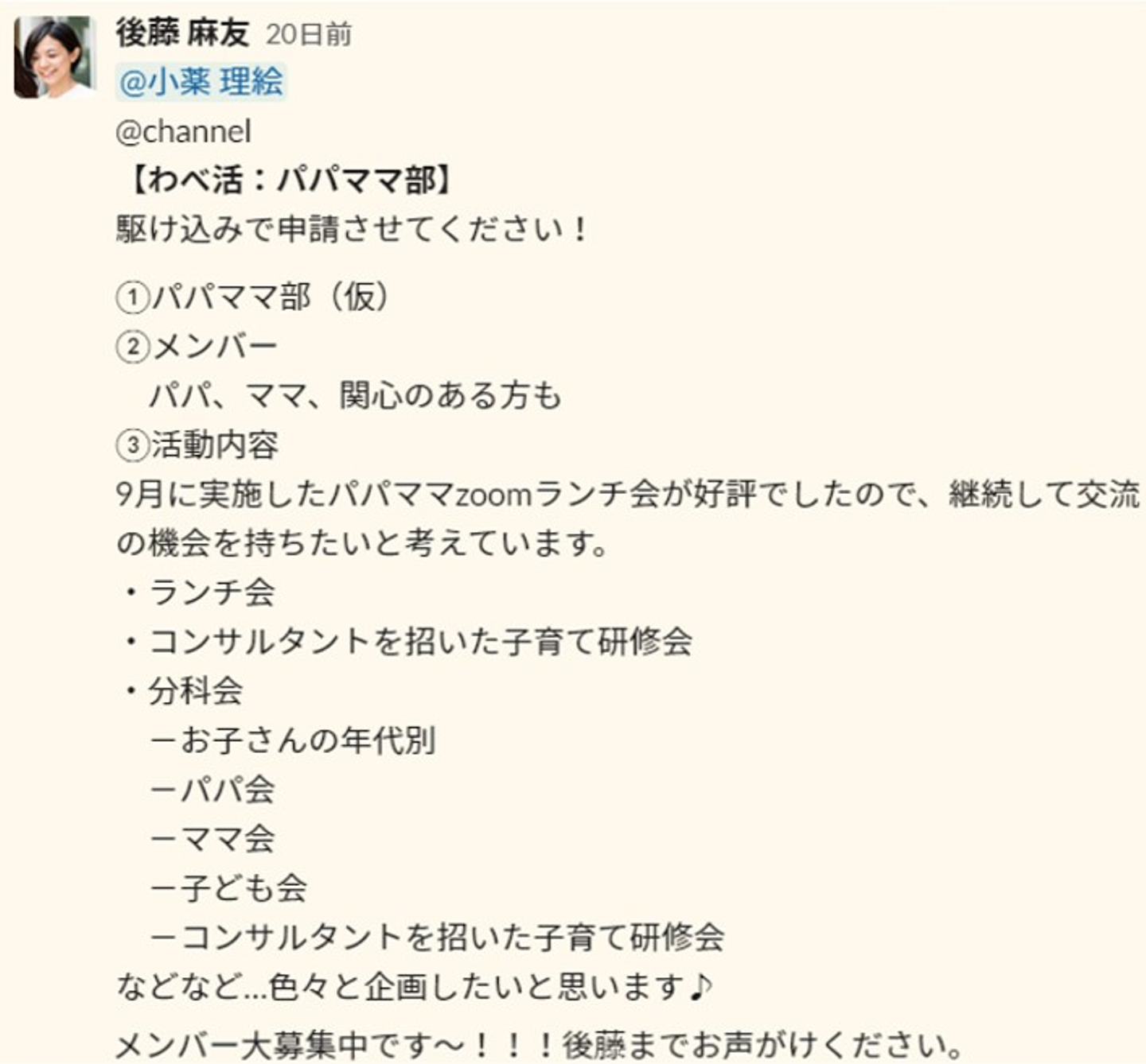 後藤さんは、昨年末に発表されたピースマインド社内の”わたしたちのはたらくをよくする”新たな取り組み「わべ活(*3)」で「パパママ部」を立ち上げていますね。立ち上げの経緯を教えてください。