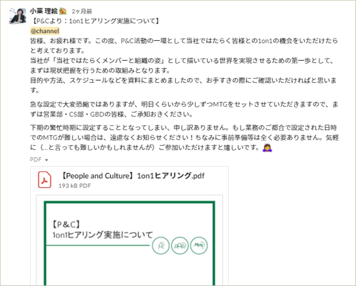 1on1ヒアリングについては、Slackで告知された概要に、社長からのメッセージも記載されていましたね。今の自分とこれから目指したい自分について見つめなおし、整理して考えるきっかけになって有意義な時間でした。役員と直接話をする機会が定期的にあるのもピースマインドの特長ですよね。