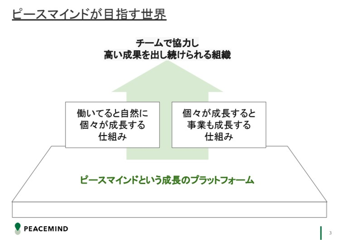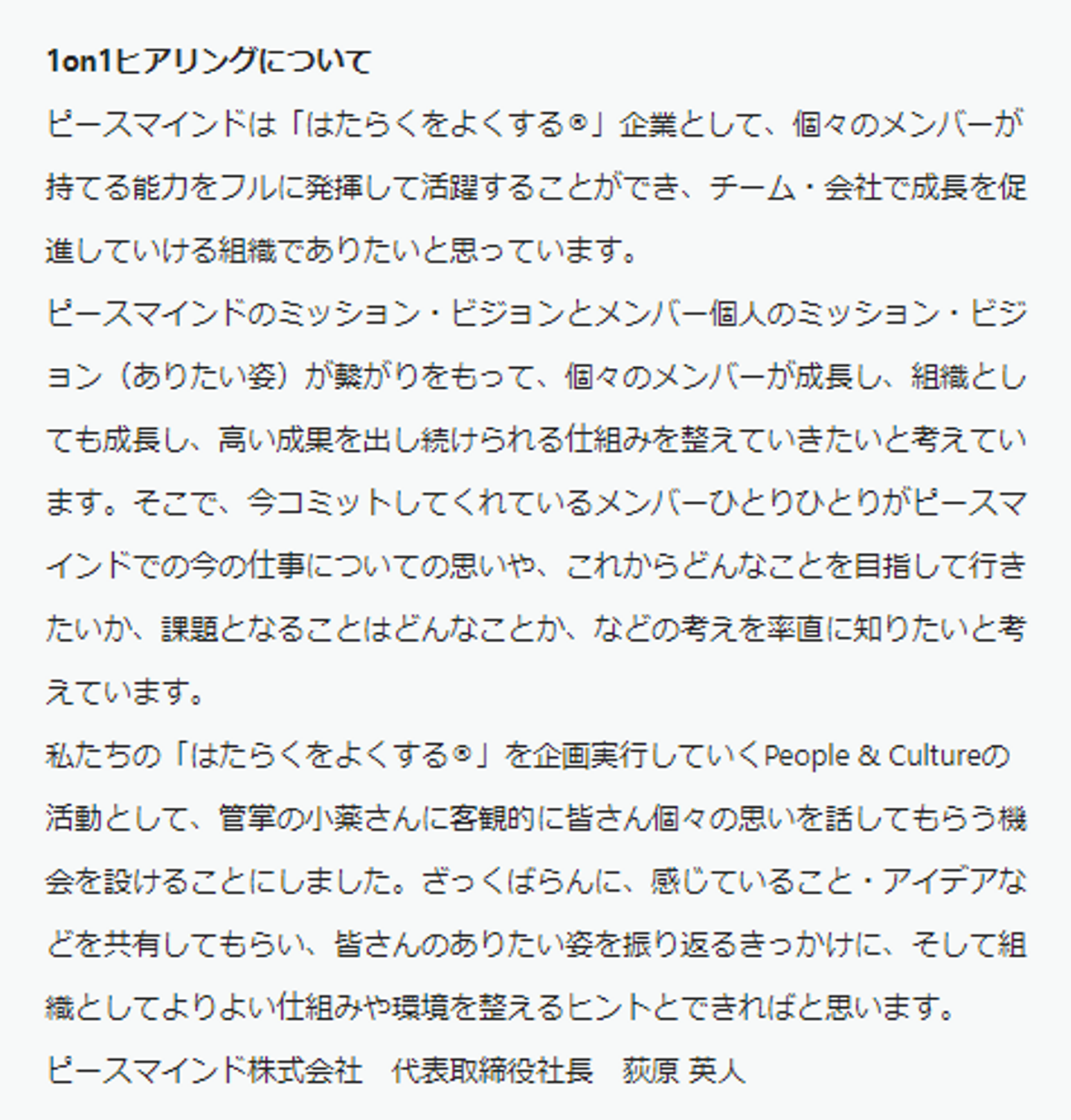 まずは、わたしたちが働くピースマインドという場・器が、全メンバーにとってどんな場でありたいかを考えた時に、メンバーが成長できる場であって欲しい、それが事業の発展にもつながっていくような会社のあり方を目指したい、という荻原社長の強い思いがありました。