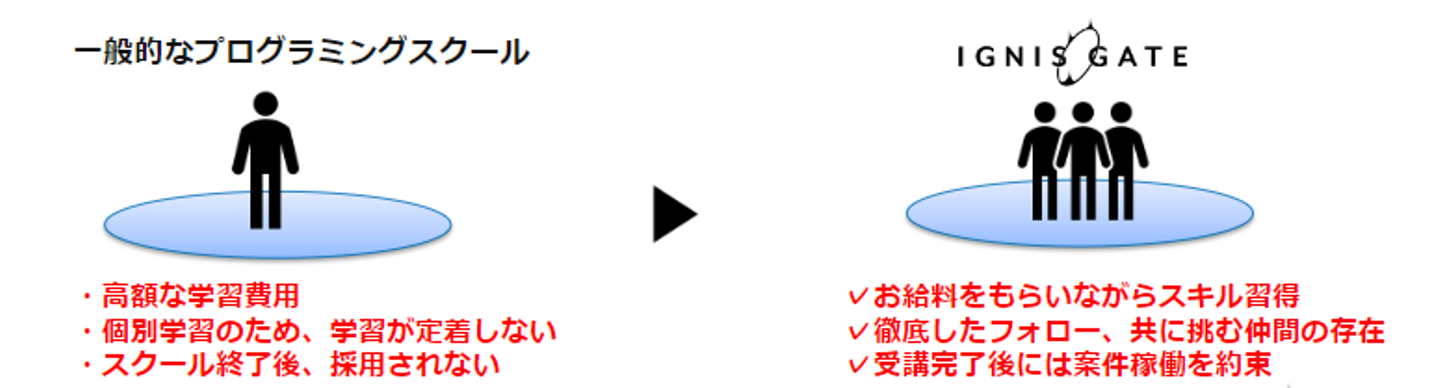スクールで学んだはいいけど実績がないという理由で、エンジニアとして採用されないことはしばしば起こります。難易度の高い未経験者のアサインを、弊社のカリキュラムとIT企業とのパイプにより実現。