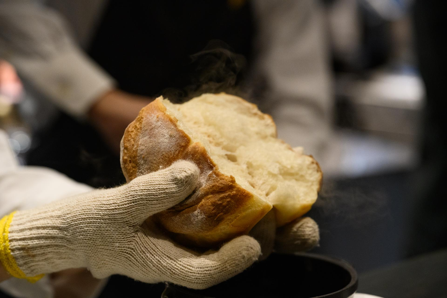 「酒粕パン」はMINAKIの酒粕を贅沢に練り込んだパンです。今回のイベント用に考案いただいたCIRPASの特別メニューなります。酒米を83%以上磨き、中心17%のみを使いつくられる極幻という日本酒の酒粕を練り込んで焼いていただきました。焼きたてのパンは半分に割ると蒸気と共に、上品な極幻の酒粕が香ります。発酵バターと共に口に入れると、酒粕と小麦の香り、バターのコクによって至福の味わいとなります。