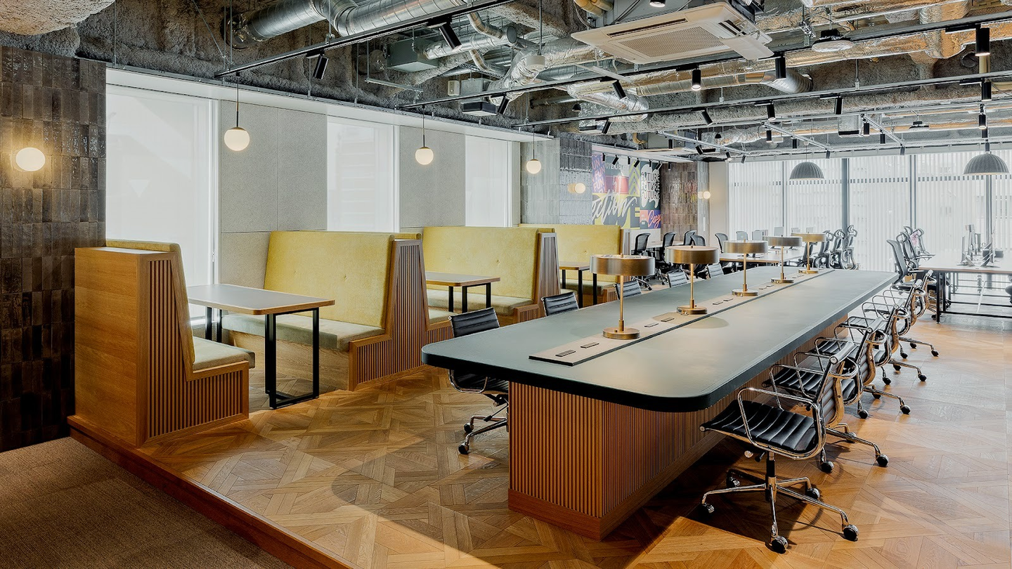 5階には、会議室やイベントスペース休憩室など、さまざまな施設を整備。7階には全事業部の執務室と、個室ブース、フリーアドレスで使用できる席を多数完備。各事業部で成約や内定承諾などが達成されると、フロアに銅鑼が鳴り響き、全員で成果を祝福します。