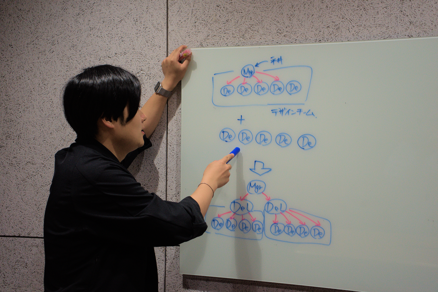 また、マネージャーレイヤーにデザイナー出身者が少なかったことも組織再編のきっかけのひとつです。今はディレクター出身のマネージャーのみのため、デザイナー特有の課題や悩みに対して、十分に寄り添いきれない部分がありました。私は職種的にはディレクターですが、もともとデザイナーとしてのキャリアも積んできたので、デザイナーメンバーの気持ちを理解しやすい。そこで「デザイナーは平井のところでまとめよう」という話になり、今の体制ができあがりました。