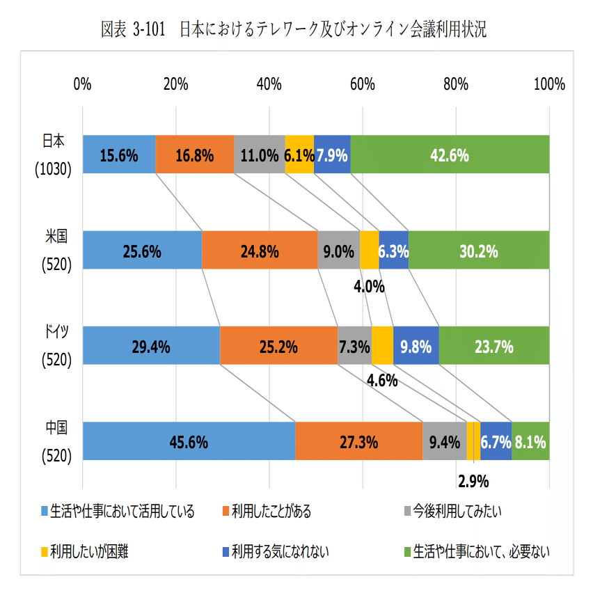 テレワーク・オンライン会議(以下「テレワーク等」とする)の利用状況をアメリカ、ドイツ、中国などの諸外国と比較した場合はこちらとなります。
