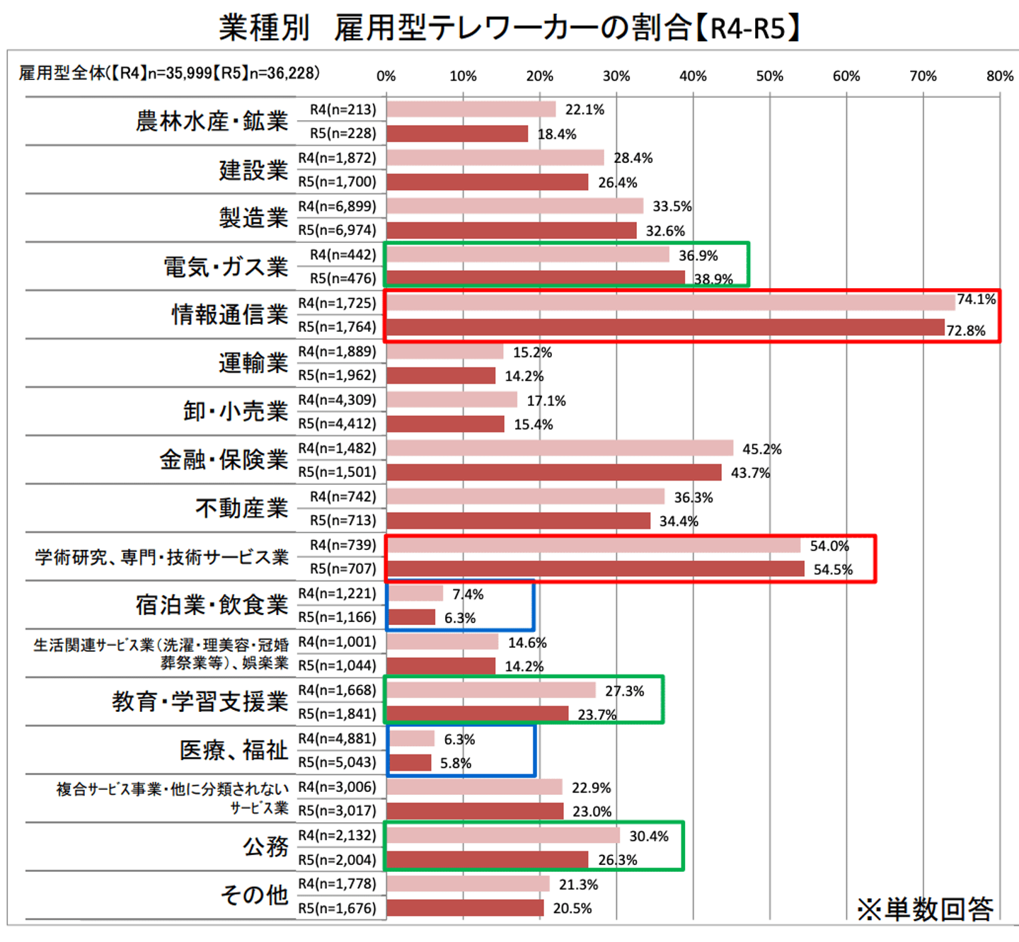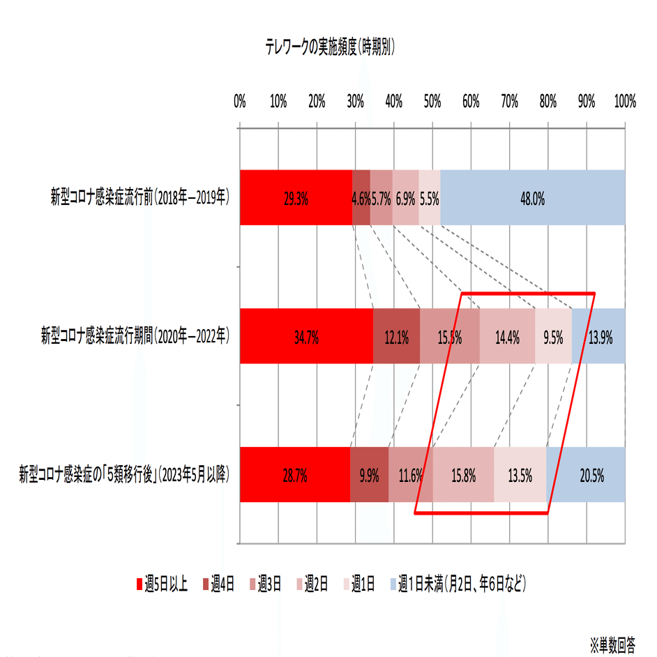 また、週5日以上テレワークしている人の割合は、新型コロナ感染症前後で大きな変化がないこともわかります。