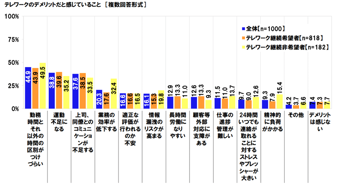 デメリットに関して、自宅=職場になるため外出が減り、仕事のメリハリがつけづらくなるようです。また、対面のコミュニケーションが少ないため、上司や同僚とのコミュニケーション不足が発生していることもわかります。
