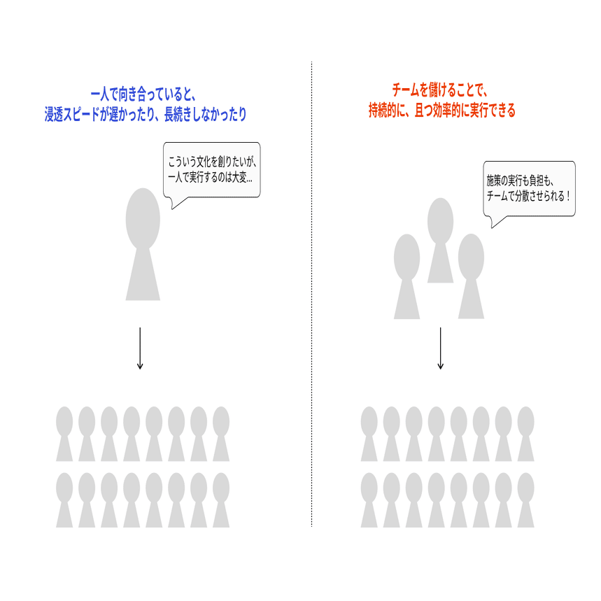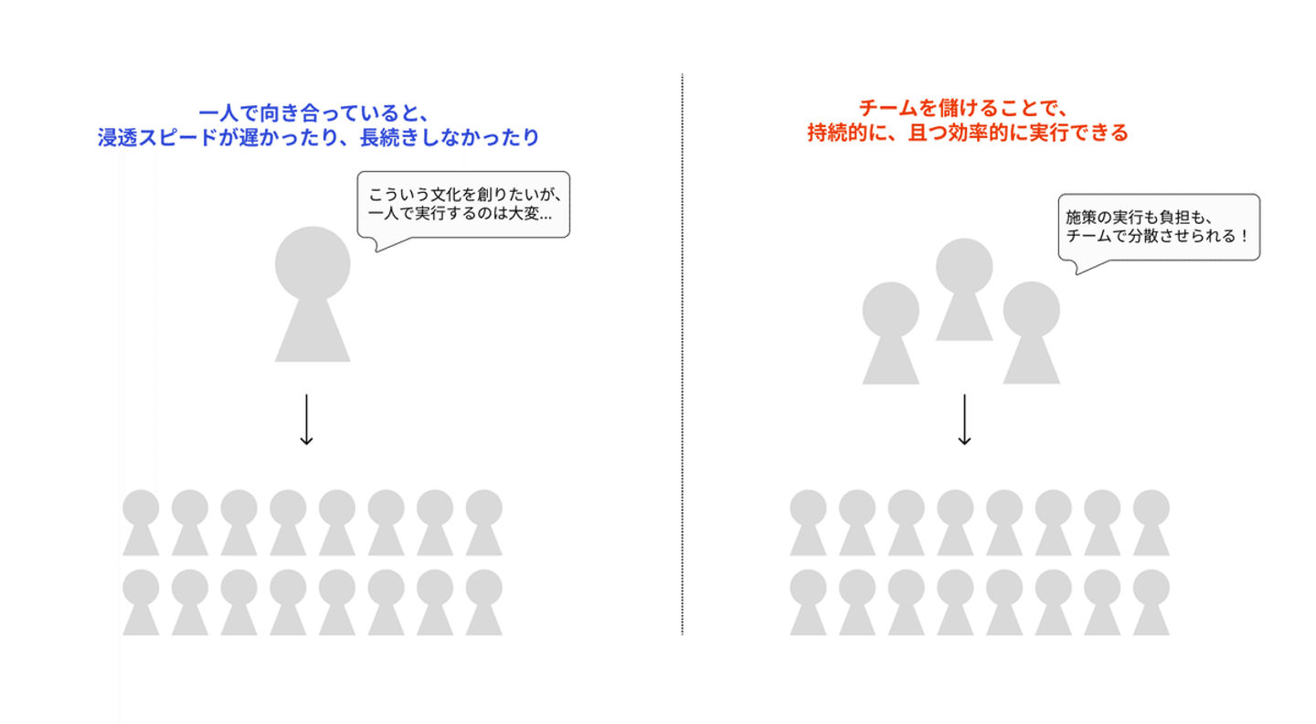根気強く取り組み続けるものだからこそ、「意志の強い一人」ではなく、組織全体で文化形成に取り組み・組織全体で維持していく。その思想こそが、文化を創っていく会社に必要な文化なのではと思います。