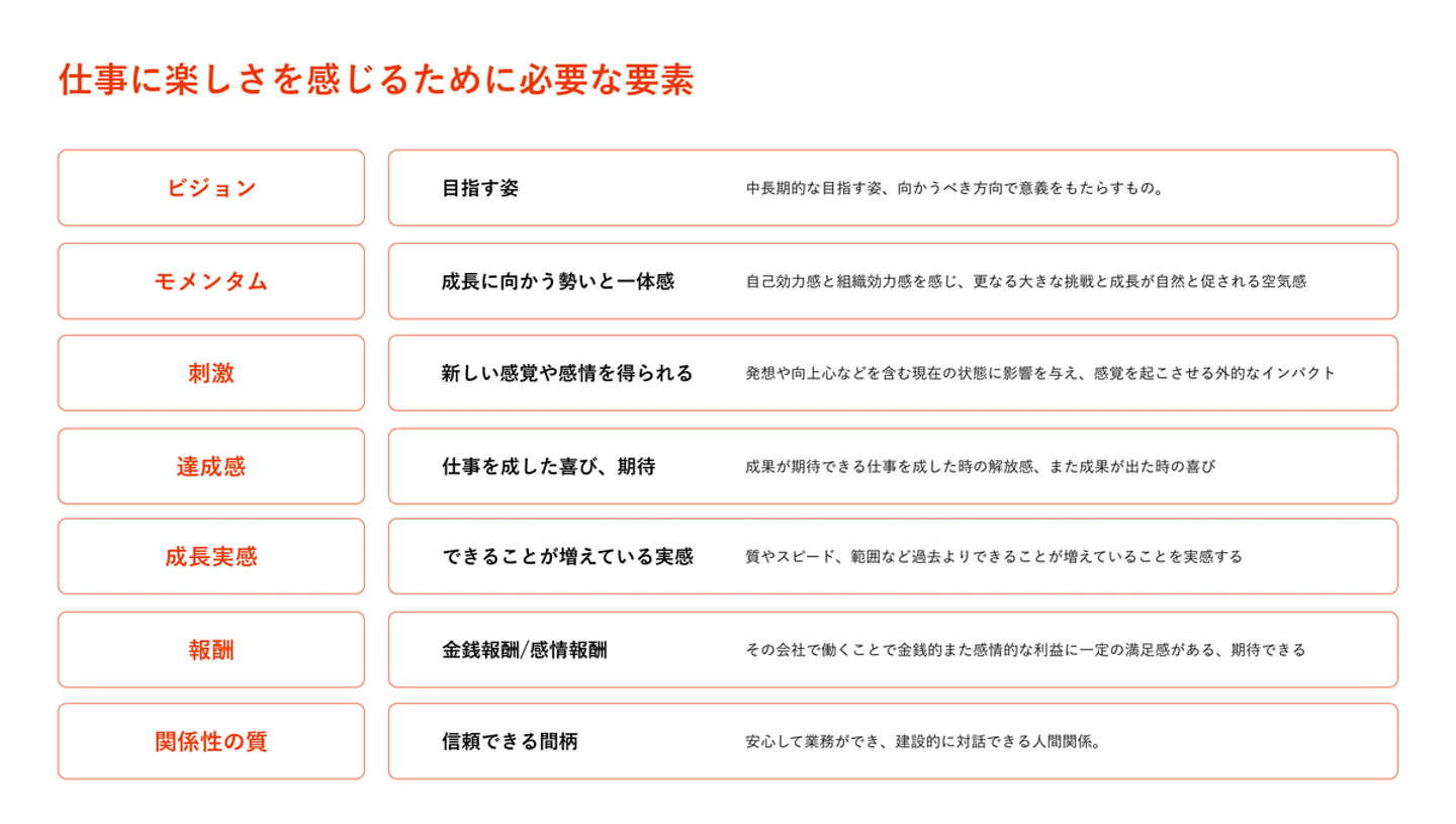 たとえば、自社のマネジメントとしてメンバーに「仕事を楽しくしてもらおう」と考えると以下の要素が考えられます。