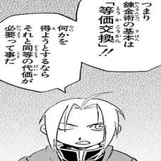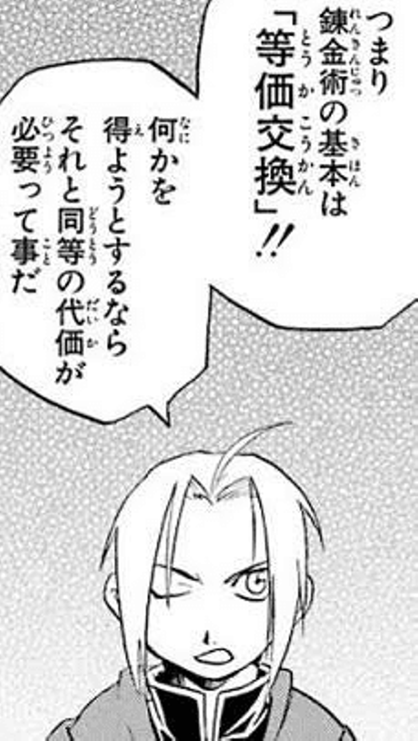 僕が個人的に好きな漫画・アニメで「鋼の錬金術師」という作品があるのですが、そこで「等価交換」という錬金術の基本法則が登場します。