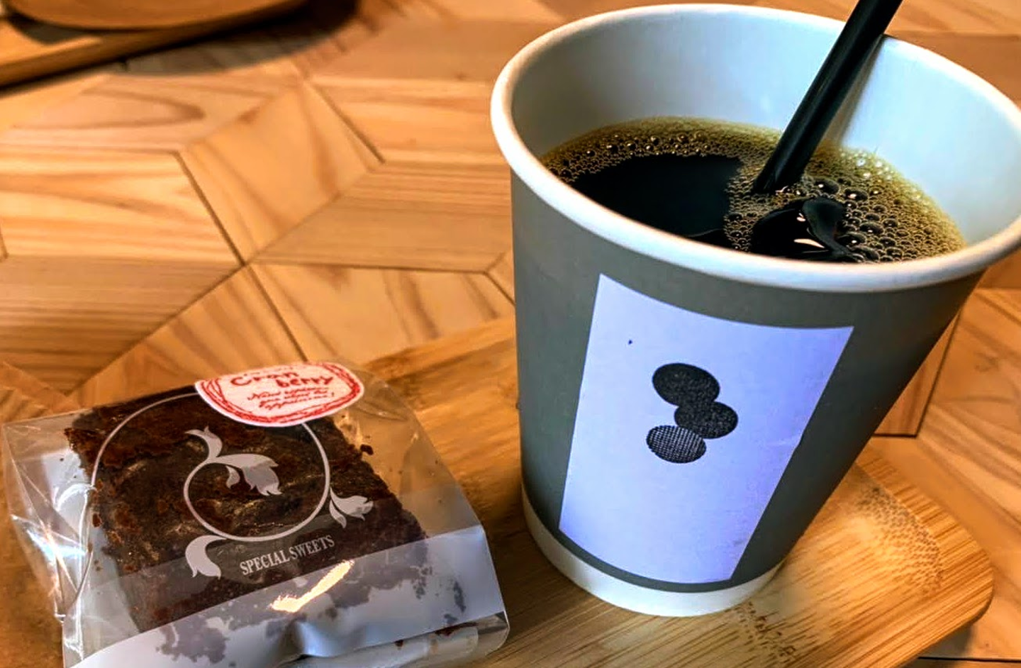 こちらもアイスコーヒーです!コーヒーのおともにはクランベリーブラウニーというお菓子をつけました。しっとり柔らかなブラウニーに、クランベリーとナッツの食感がアクセントになっています。おいしい!
