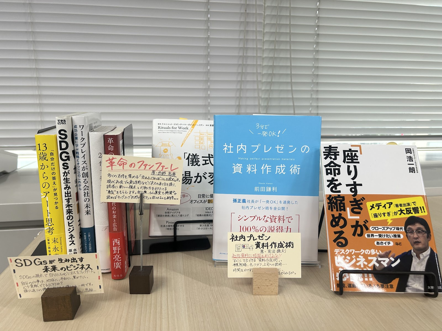 書籍は従業員からのおすすめをもとに厳選しており、ビジネス書や自己啓発書だけでなく、デザイン関連の書籍や趣味に関する本など、幅広いジャンルが揃っています。また、資格取得や業務スキルの向上に役立つ書籍も豊富で、業務の合間や休憩時間に新しい知識を吸収することができます。