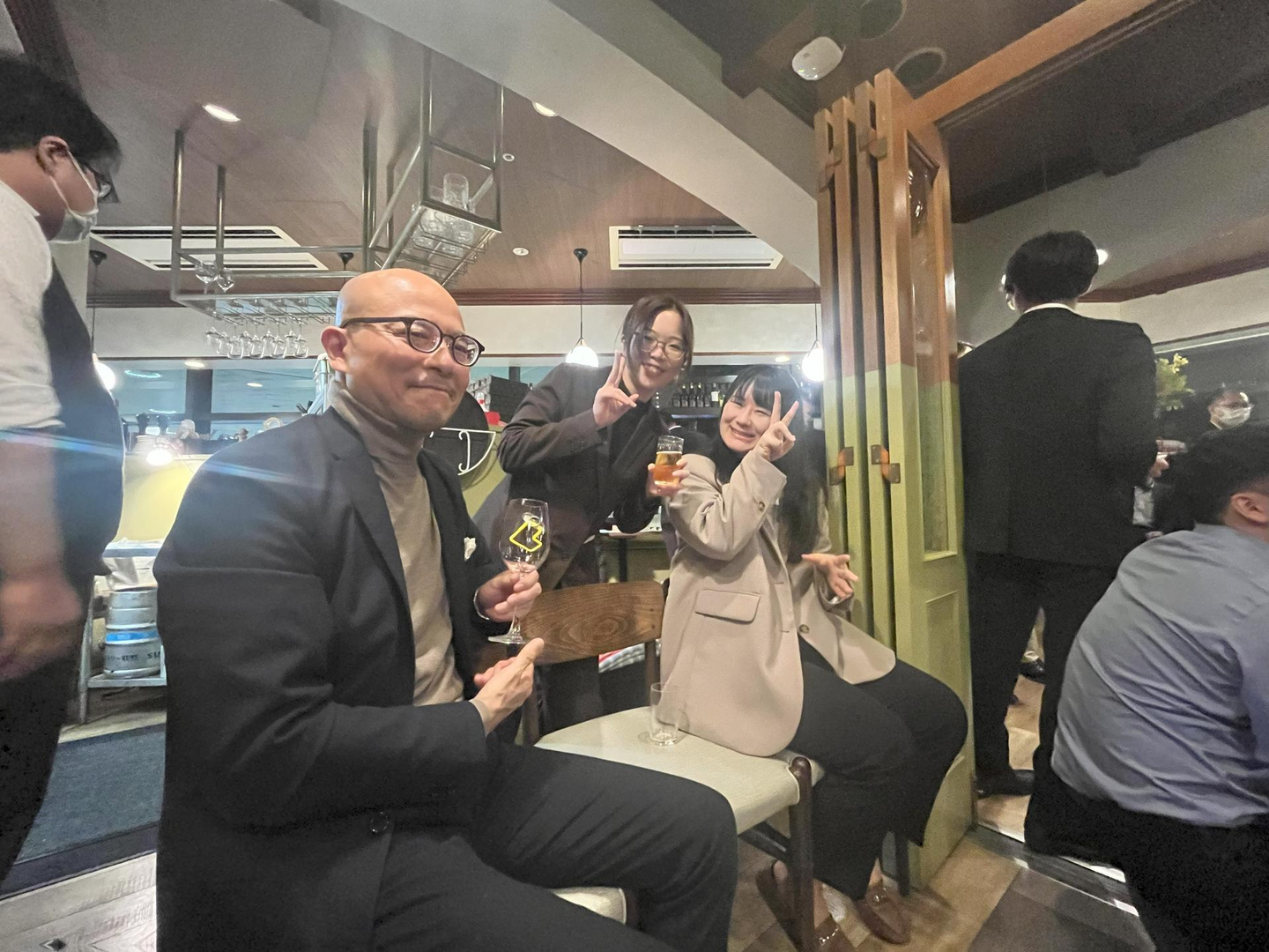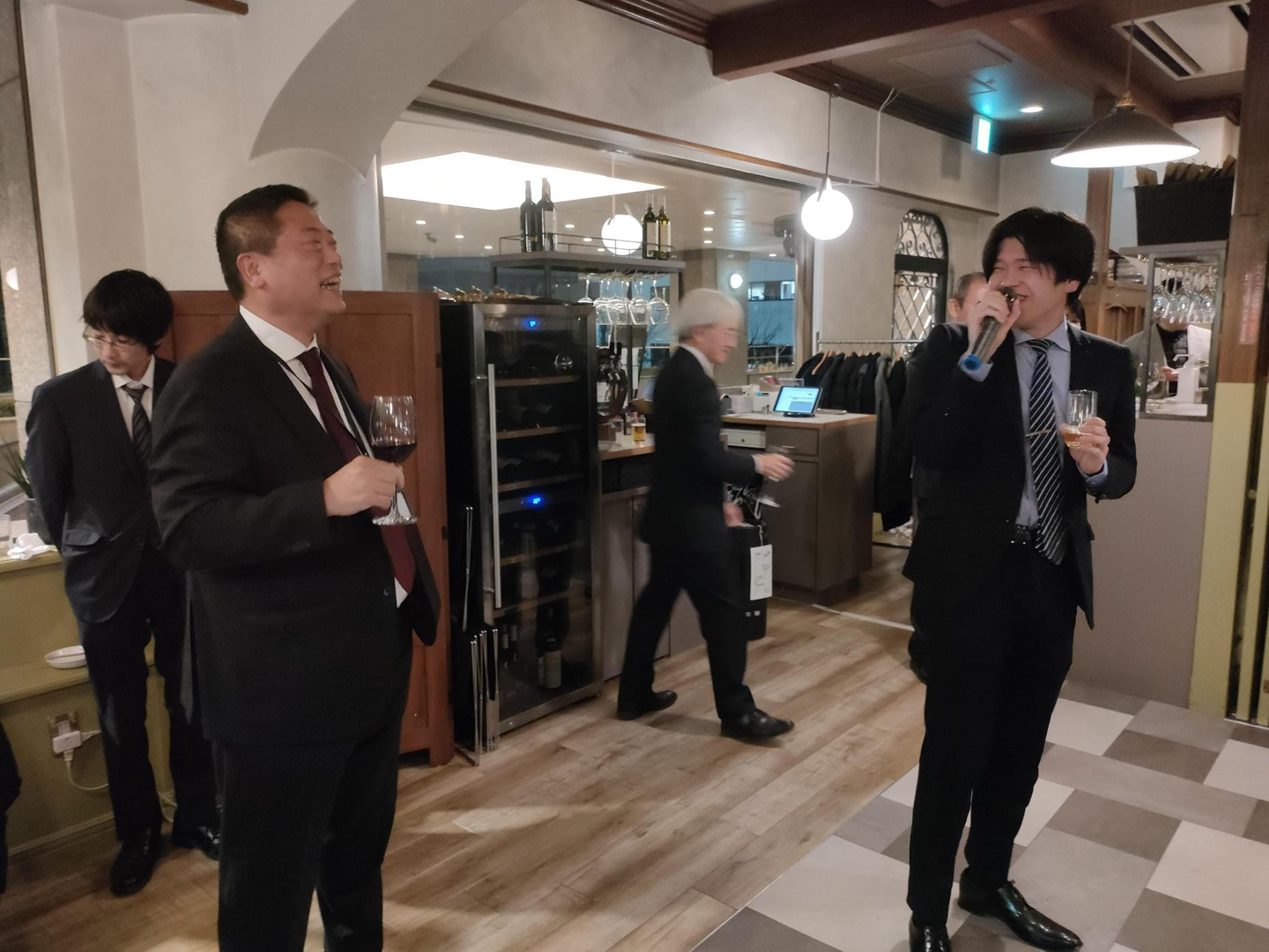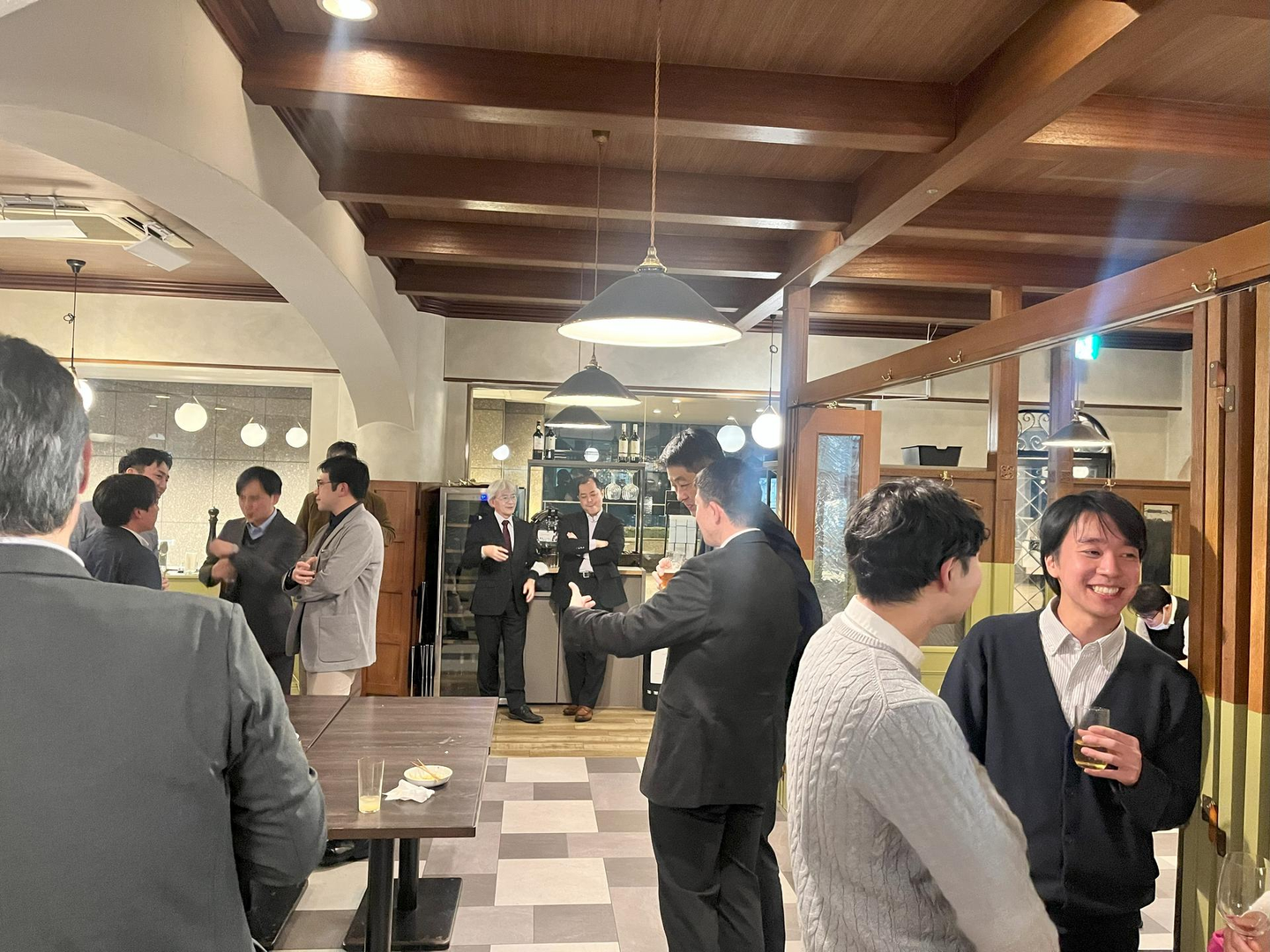 東京事業所のメンバーは、オフィスの近くにあるイタリアンレストランで立食パーティを行いました。各部署の代表者が選抜され、今年1年での取り組みや来年に向けた意気込みについて語りました。テレワークが多いため、久しぶりにリアルで会う同期や他部署のメンバーとの会話に花を咲かせていました。12月に入社したばかりの社員も賑やかな雰囲気に溶け込んでいました。