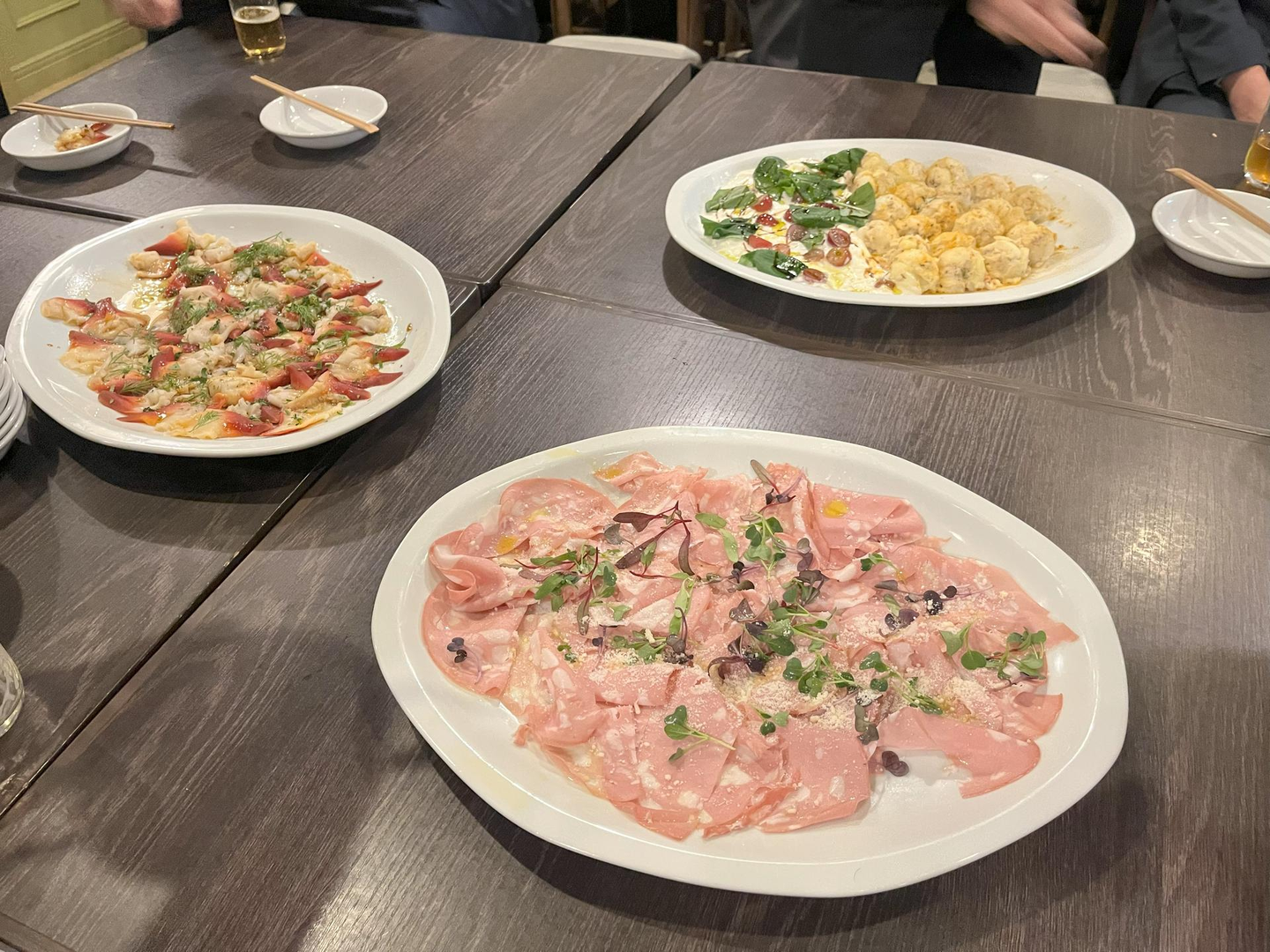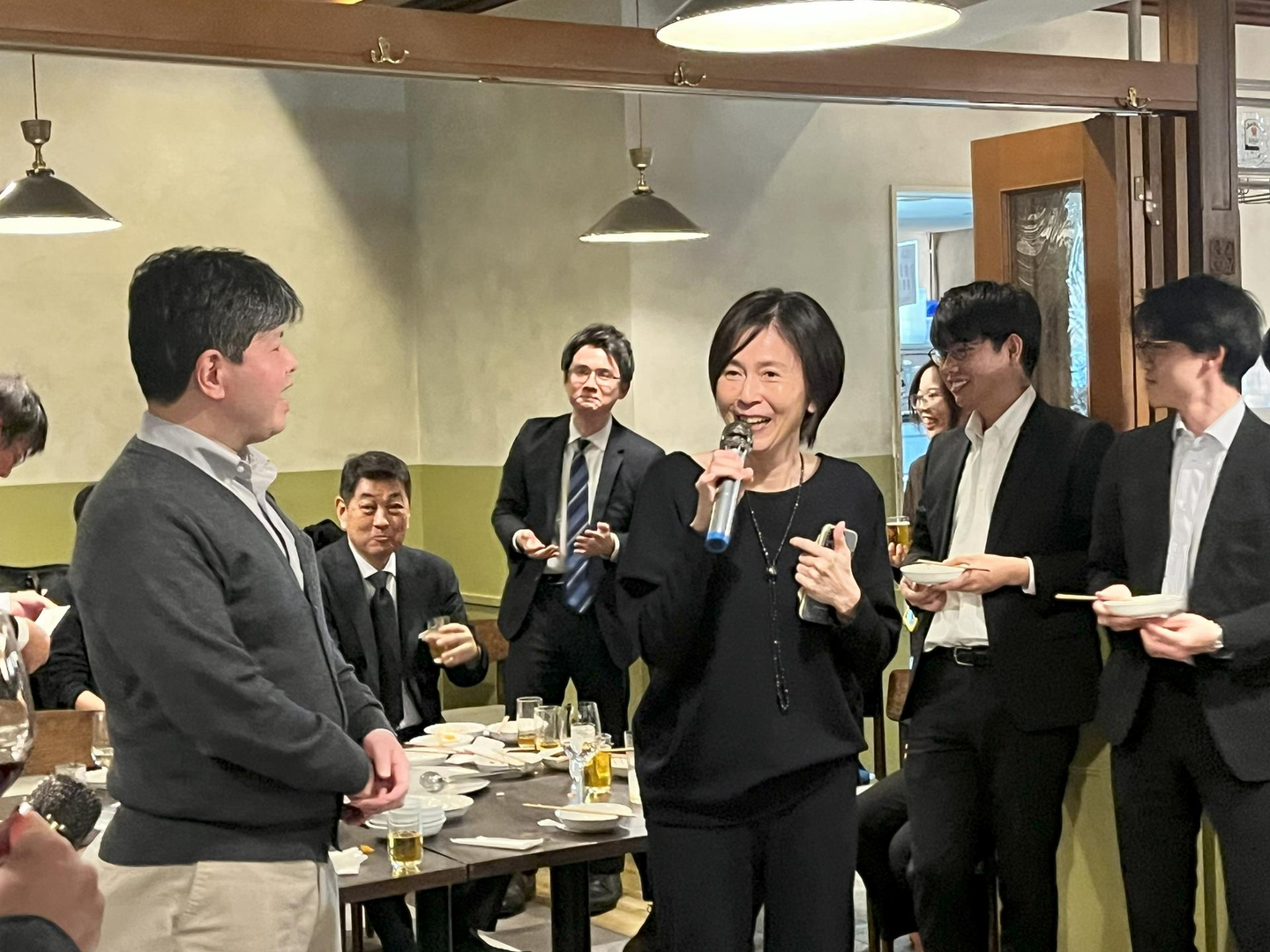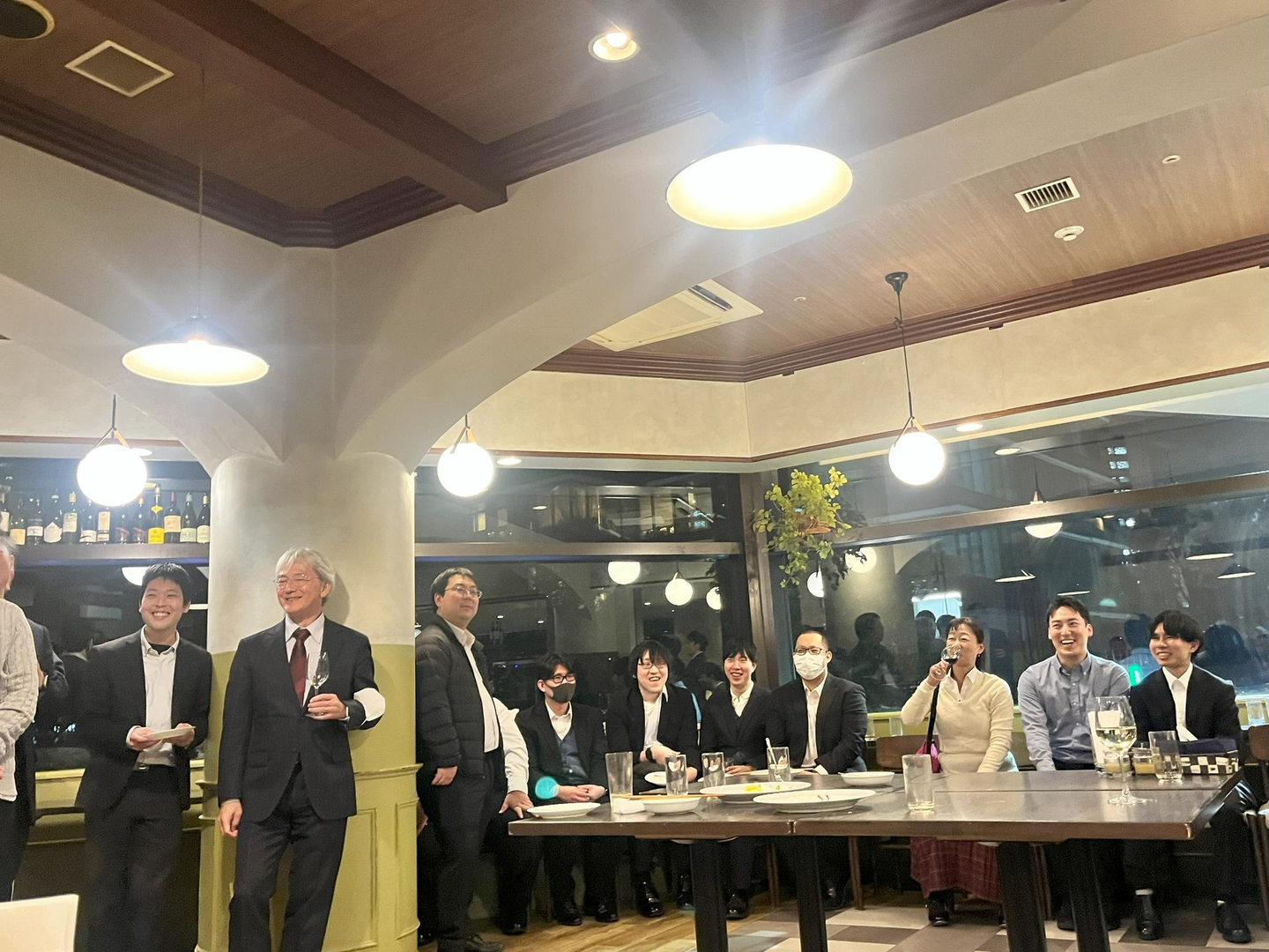 東京事業所のメンバーは、オフィスの近くにあるイタリアンレストランで立食パーティを行いました。各部署の代表者が選抜され、今年1年での取り組みや来年に向けた意気込みについて語りました。テレワークが多いため、久しぶりにリアルで会う同期や他部署のメンバーとの会話に花を咲かせていました。12月に入社したばかりの社員も賑やかな雰囲気に溶け込んでいました。