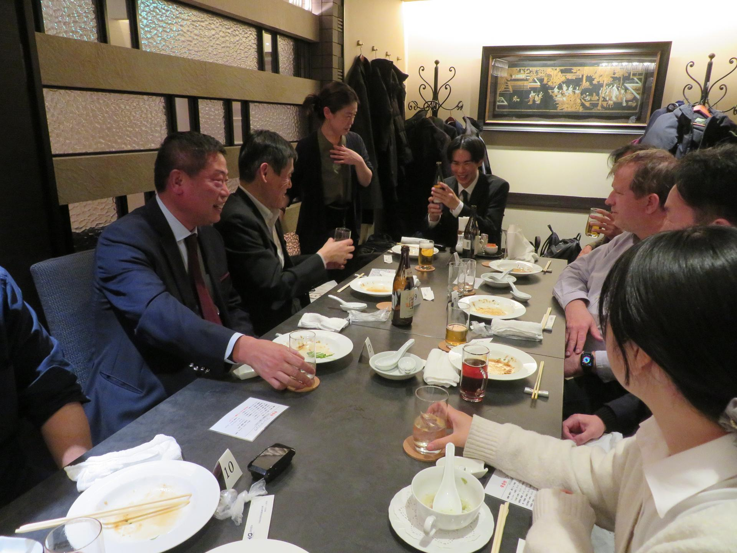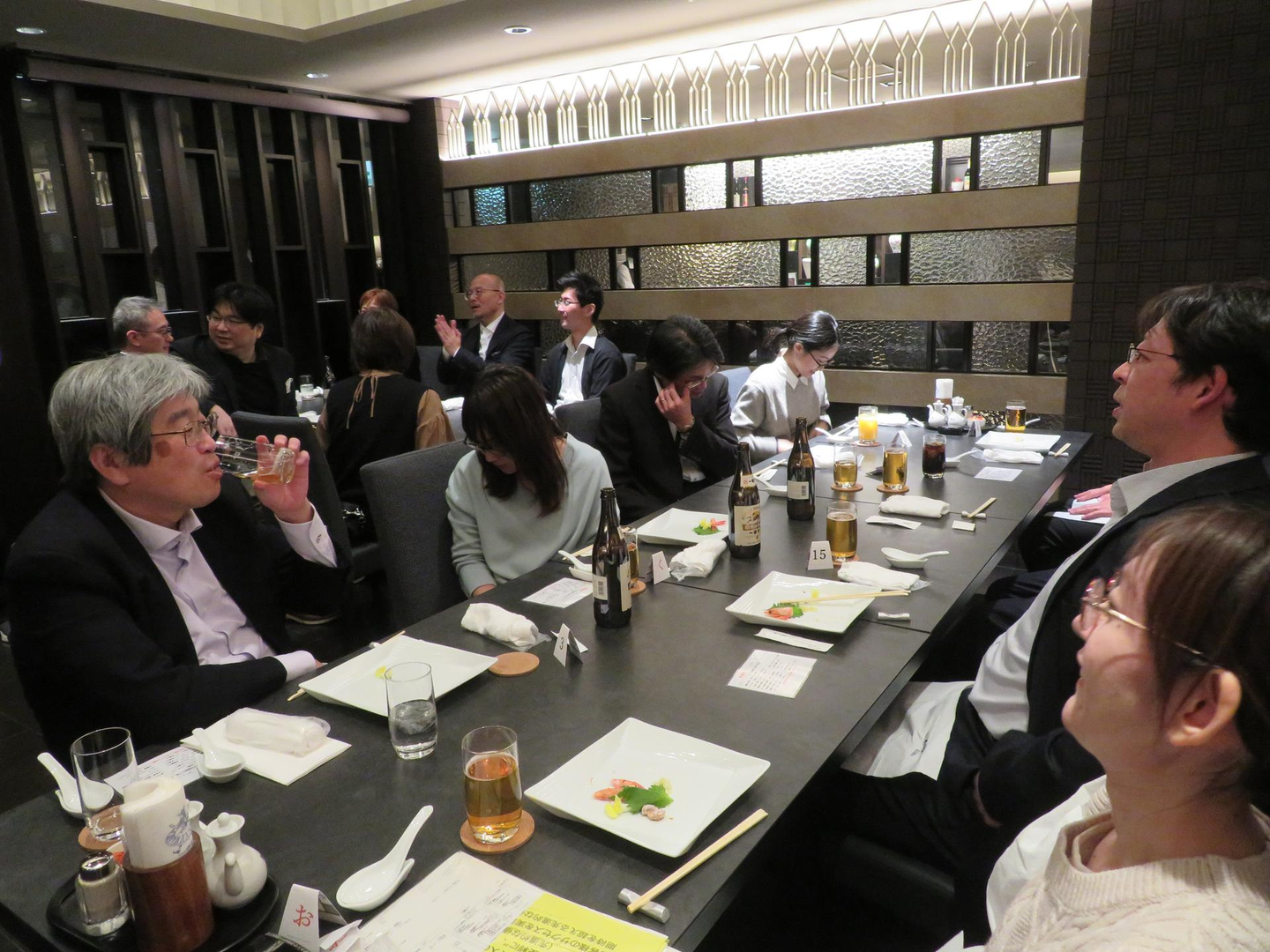 大阪本社の忘年会では、中華のコース料理を頂きながら、今年の出来事や来年に向けての想いを社員が語りました。(感動のスピーチに目頭が熱くなる場面もありました!)若手社員が"先輩や上司にお酒を注ぐ"という昔懐かしい風習に興味を持ったようで挑戦しましたが・・・本社のメンバーはどちらかというとシャイなのです。注がれる側が慣れておらず、笑いが絶えませんでした。数日前に入社したメンバーもすっかり打ち解けていて、皆で楽しい時間を過ごしました。