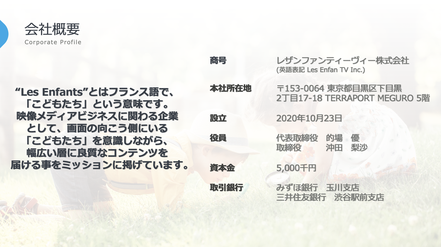 2ヶ月ほど業務をやっているうちに、他にも多くの子供向けYouTubeチャンネルが類似の課題を抱えている事に気づきました。私は、自身が番組の取りまとめ役となり、「YouTubeだけでなく、動画配信サービスにも幼児番組を提供するサービス(コンテンツをキュレーションするためのブランド)を始めたい」そんな考えに至り、そのキュレーションサービスに「Les Enfan TV」という名前をつけ、当社の歴史が始まりました。2020年9月の事でした。