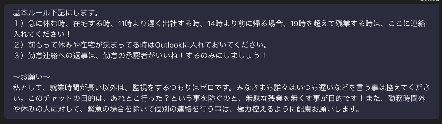 私の答えは、「互いをリスペクトできる社員」が集っているからだと考えています。勤怠連絡のTeamsには下記のルールを定めています。しかし、以前派遣社員を入れていた際に、管理監督者(私)の幼稚園の送迎の都合で、定時を10時〜18時に設定した名残りで、何となく、10時前になると、自然発生的に出社時間の連絡がチャットで入ります。何となく、全員が10時を出社時間の目標にしているため、周りに迷惑をかけないようにとの配慮が出来ている結果の行動だと私は考えています。