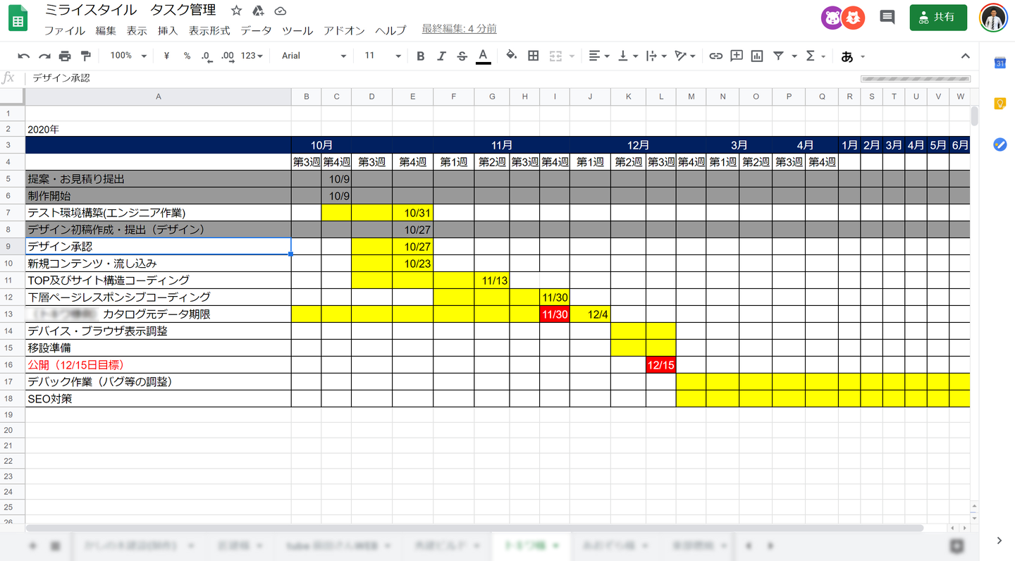 制作工程はスプレッドシートで各メンバーが共有。クライアントへの説明にも活用しています。