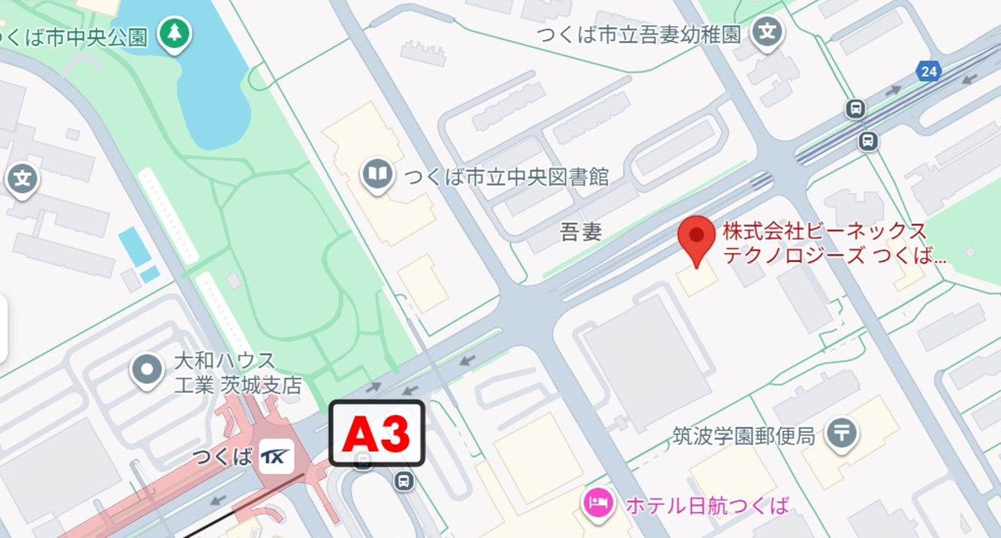 当社つくばオフィスは、つくばエクスプレス つくば駅から徒歩5分の位置にあります。