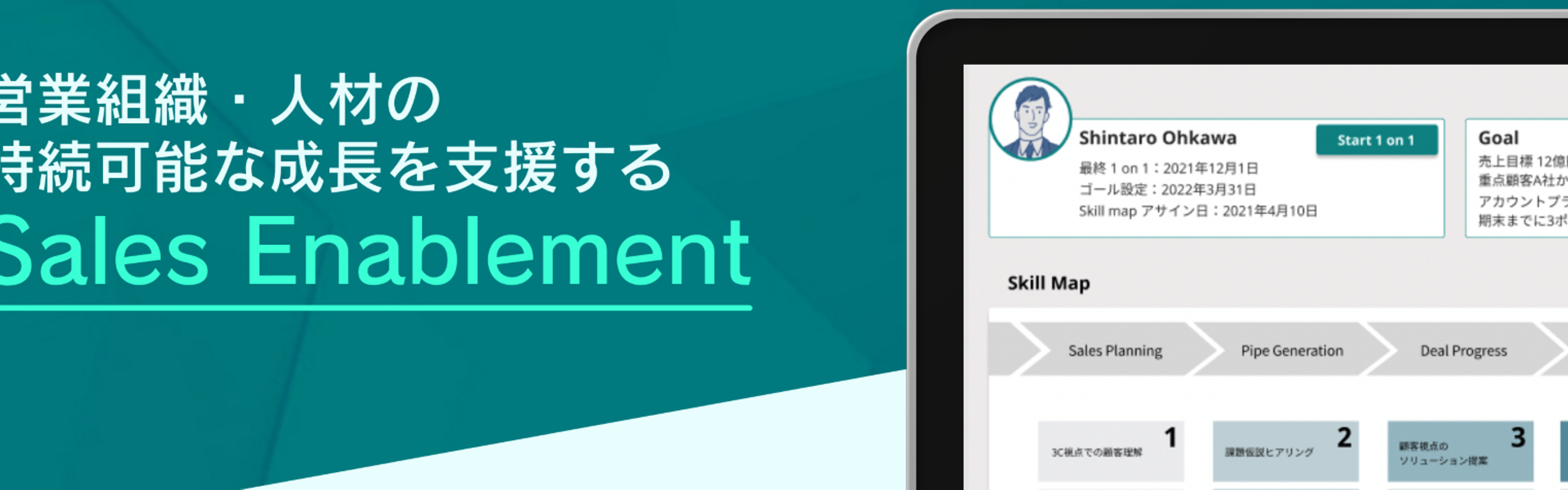 成果を出す営業社員を輩出し続ける人材育成の仕組み”Sales Enablment”の専門企業として、 「営業成果の人材育成体系を構築するプロフェッショナルサービス」 「営業成果と育成データ有機的に連動させるクラウドアプリケーションサービス」 この2つのサービスを一気通貫して提供することで、世の中の営業組織・人材の継続的な成果創出に貢献していきたいと考えています。