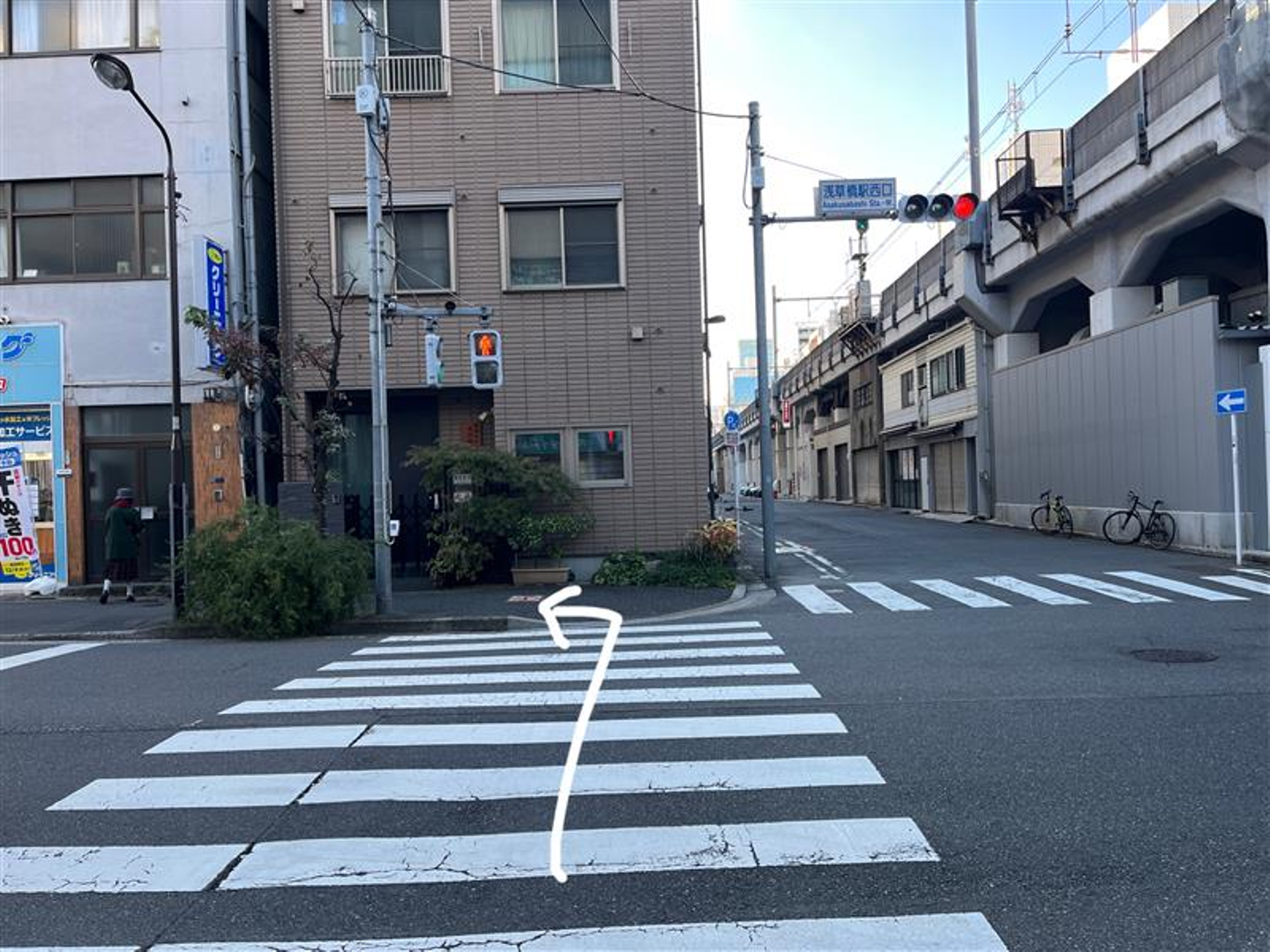 ③「浅草橋駅西口」の信号に到着したら、信号を渡ってから左折します!