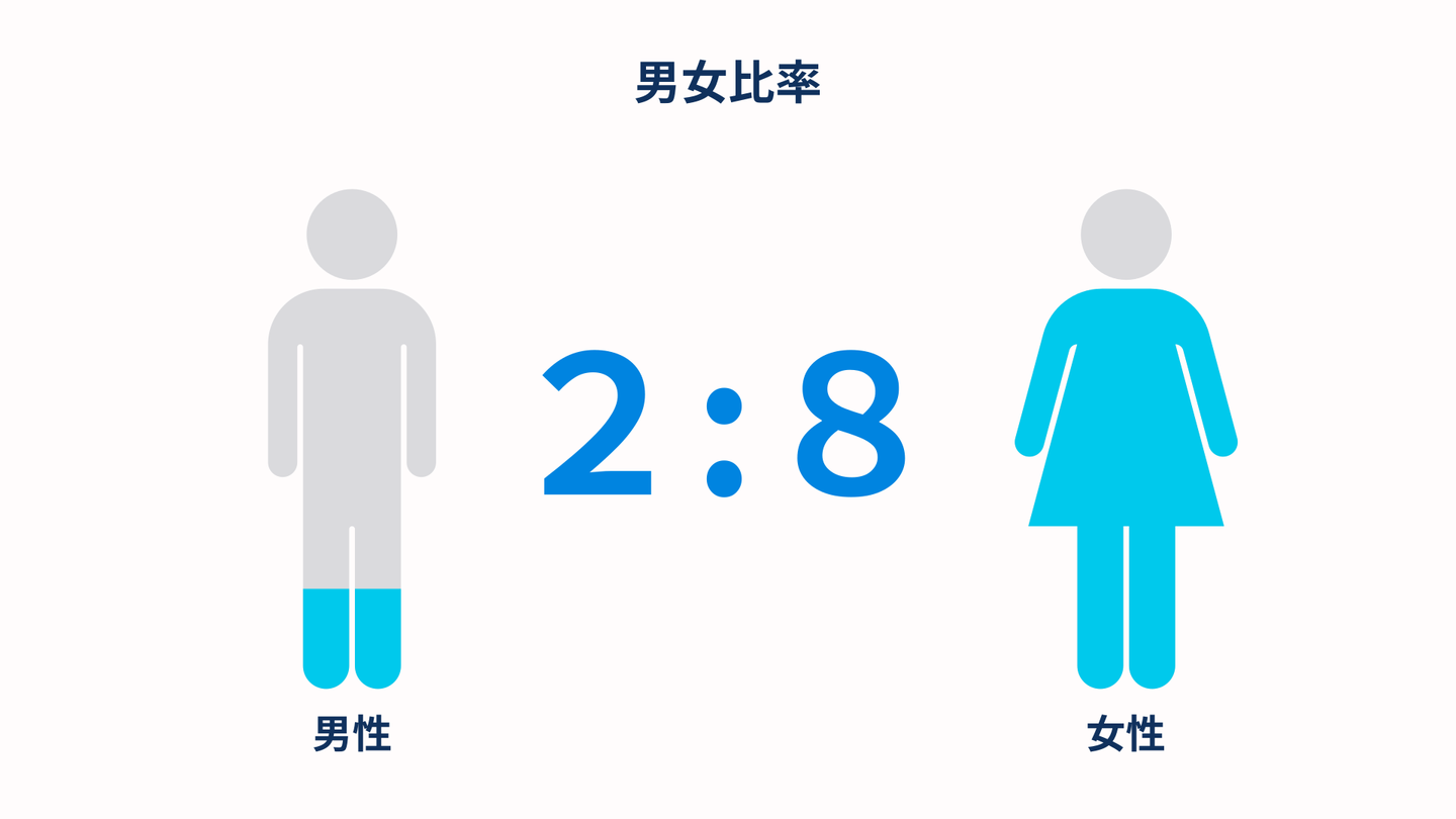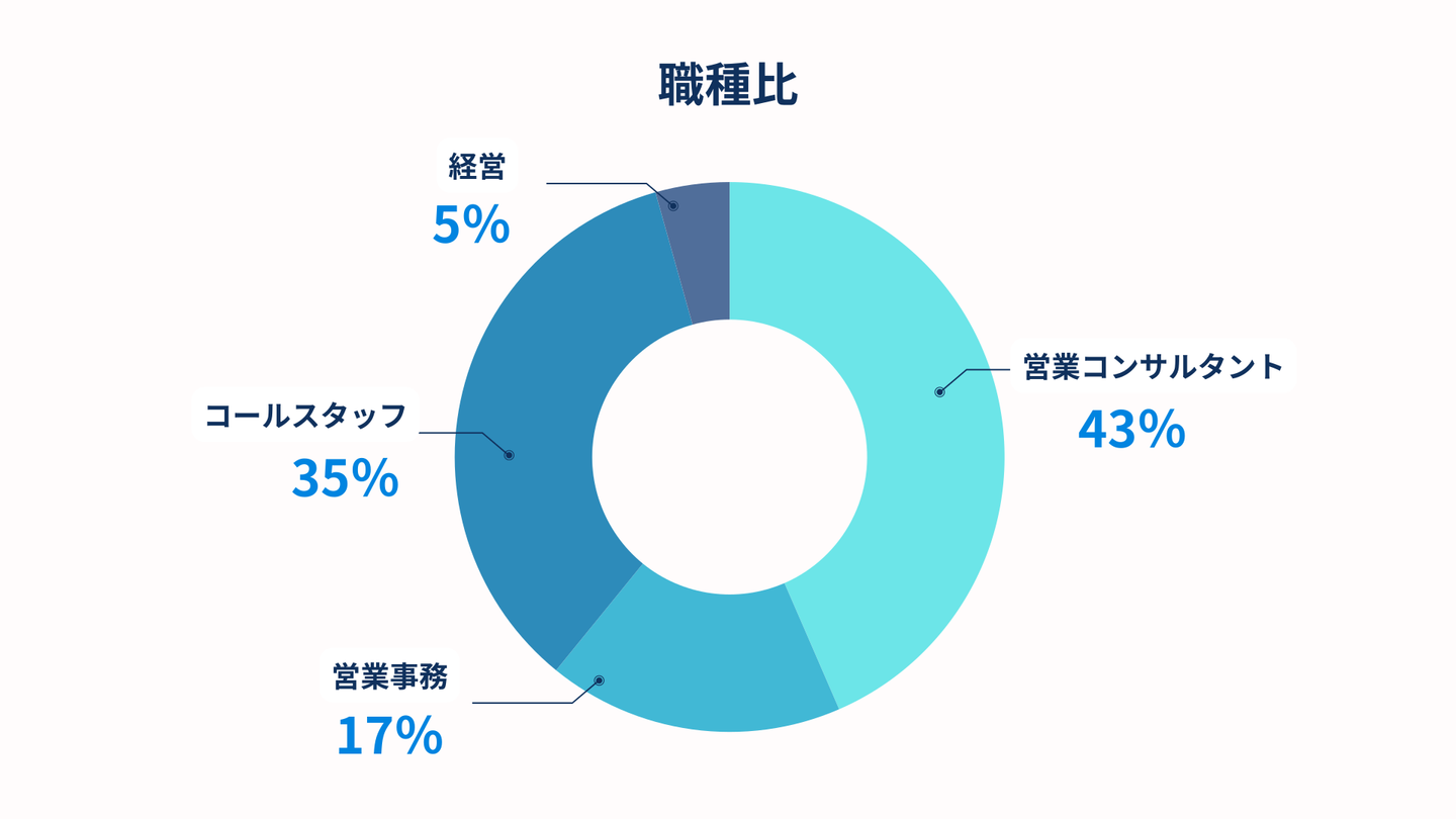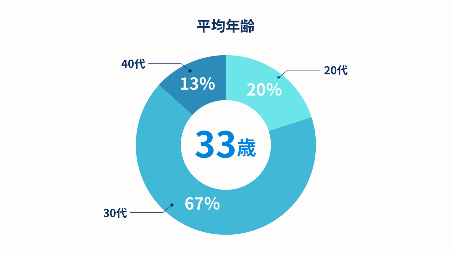 一般的な企業平均よりは低めの結果ですね。主に20代中盤〜30代が活躍中。社会人経験を活かしながら、挑戦し続けられる環境です!