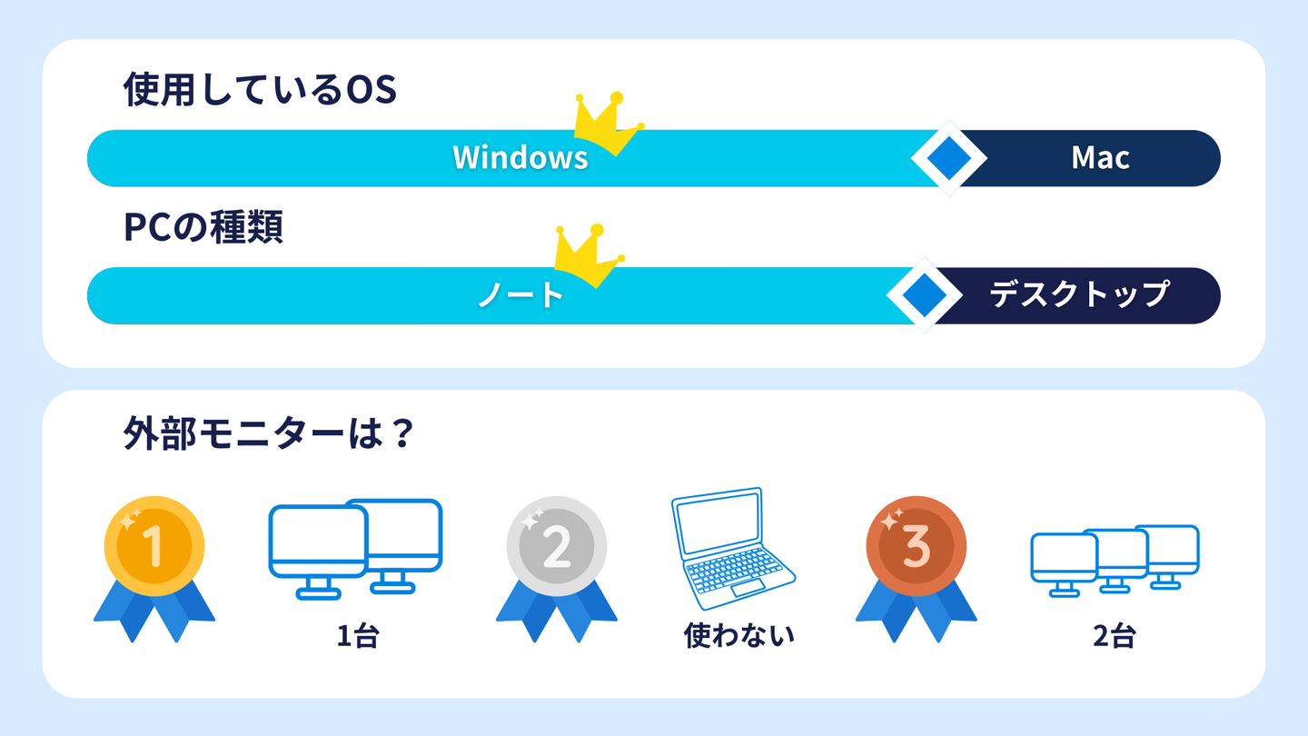 ノートPCをメインにしつつ、必要に応じてモニターや周辺機器で拡張しているメンバーが多い結果となりました。