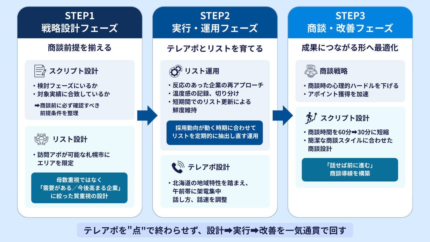 単に電話をかけるのではなく、特定技能・技能実習という業界特性を前提に、スクリプト設計・リスト設計・架電設計・商談設計までを一体で構築しています。