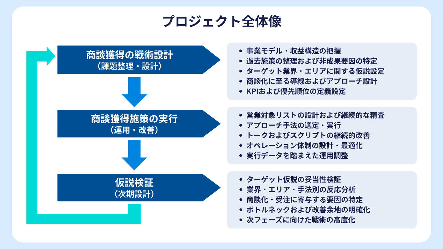 はい!今回のプロジェクトでは、BKUの新規開拓を目的に、テレアポを起点とした営業設計・実行・改善を行いました。