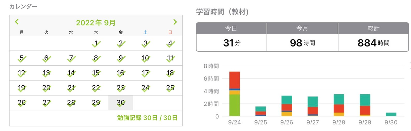 また習慣化についても、(学習の目的と手段が明確になったこともありますが)1か月の学習時間の目標を立て、日々の生活習慣にまで落とし込むことで、今時点では習慣化され継続することができています。