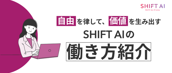 SHIFT AIは「日本をAI先進国に」をミッションに、AIのビジネス活用を学べるAI大学「SHIFT AI」の運営を中心に、AIに関する情報発信はもちろん、教育、活用支援の3つの軸で日本のAI推進を加速するインフラづくりを行っています。