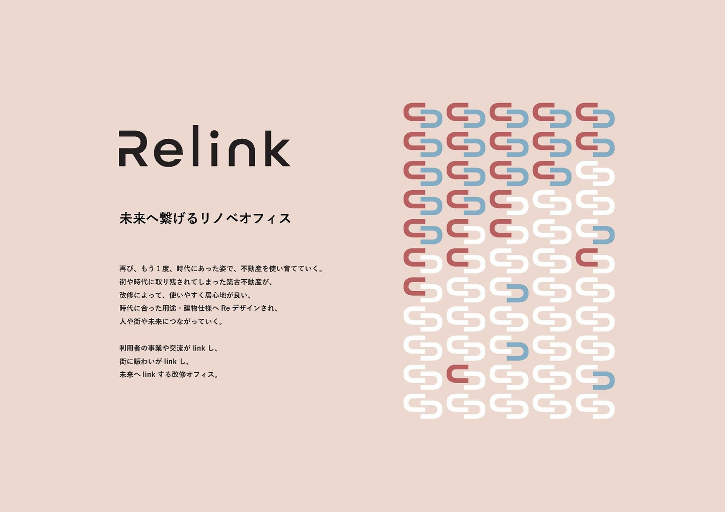 「Relink」の文字がデザインされたグラフィックは企業同士、人同士、そしてこの街とのつながりと広がりを表現