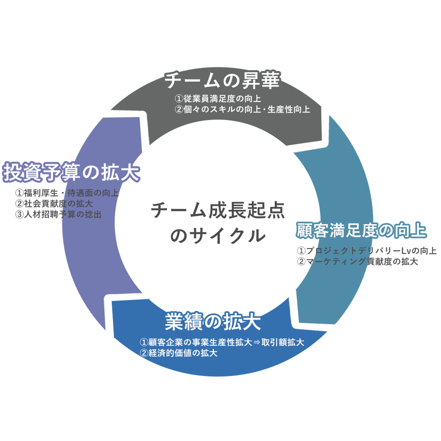 メンバードリブン経営とは、①従業員満足度が上がれば、②パフォーマンスも上がり、③業績拡大や、④ひいては社会貢献度の拡大に繋がるという考え方で、一緒に働くメンバーを最大限尊重するという経営スタイルです。