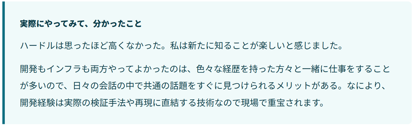 開発経験があってよかったと思ったところは、検証作業中にミドルウェアのエラーログを読む際、何が原因になっているかおおむねあたりを付けられたことですね。
