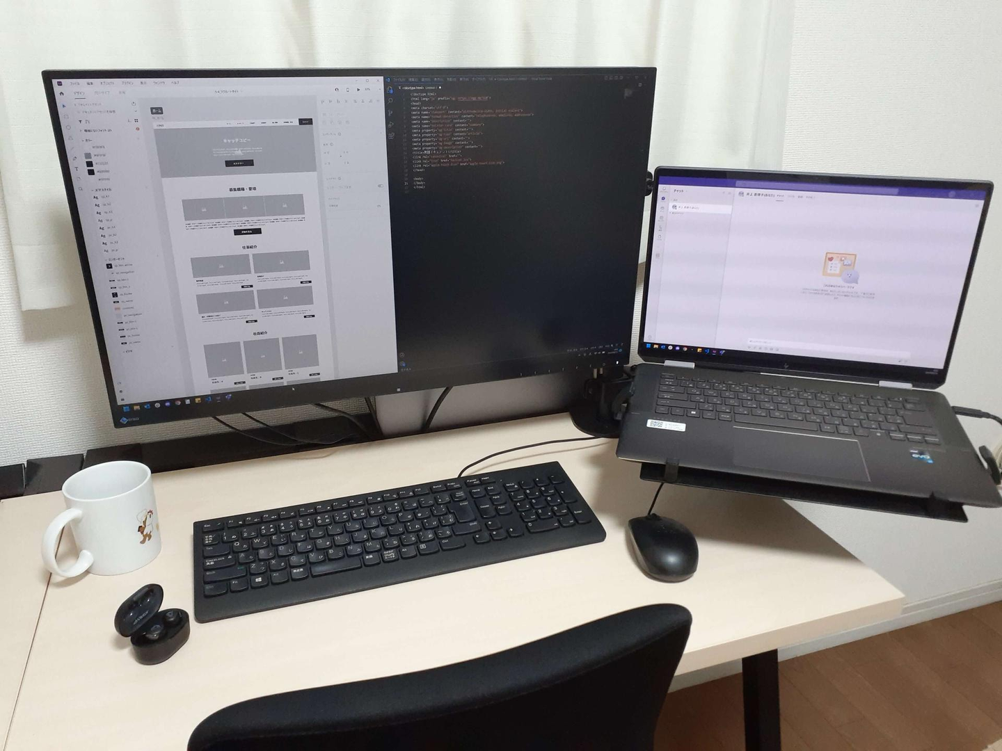 ▲リモート環境。PC(HP Spectre)とモニタ(EIZO FlexScan)は会社支給