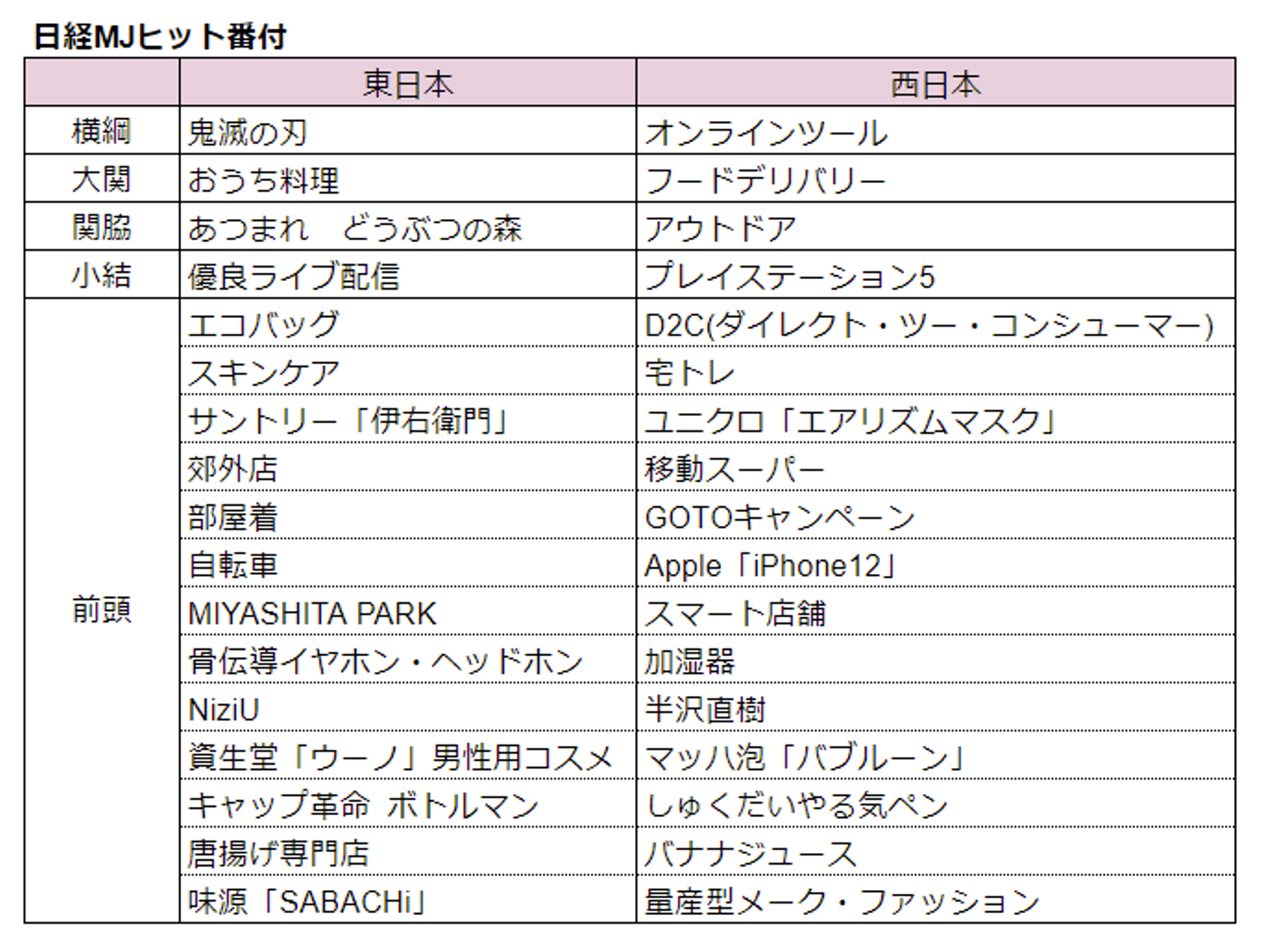 2020年日経MJヒット番付では、東日本で鬼滅の刃。西日本でオンラインツールが横綱になりましたね。どこにいっても、鬼滅の刃、鬼滅の刃状態だった2020年。2021年は何が流行るのか、楽しみでもあります。