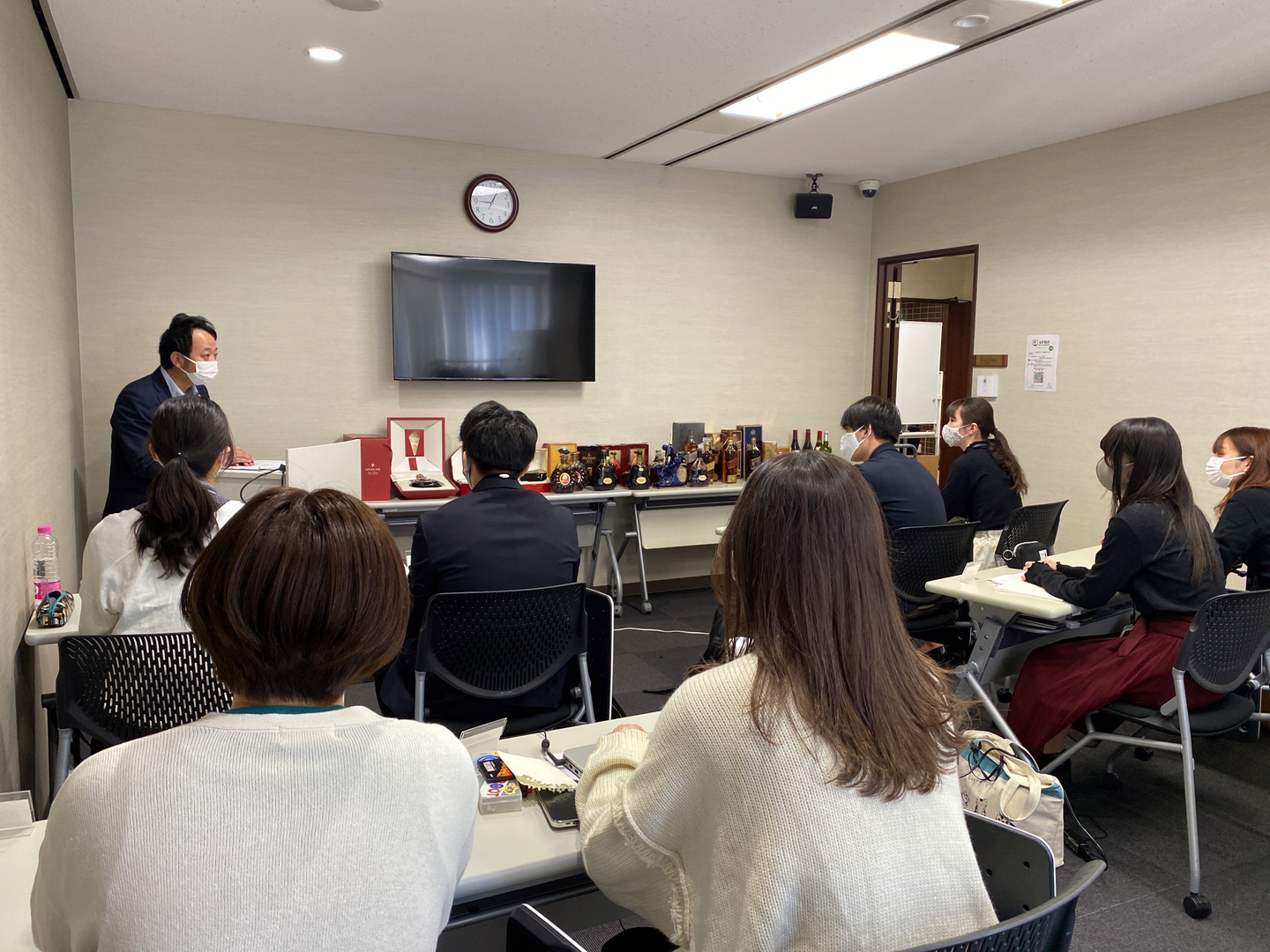 グループ会社のお酒の知識をはじめ、取扱品目まで学んでいきます。貴金属・ブランド品以外にも様々な種類の取扱業務があるんです。普段飲めないお酒もズラリとならび、皆たのしそうに聞いていました。