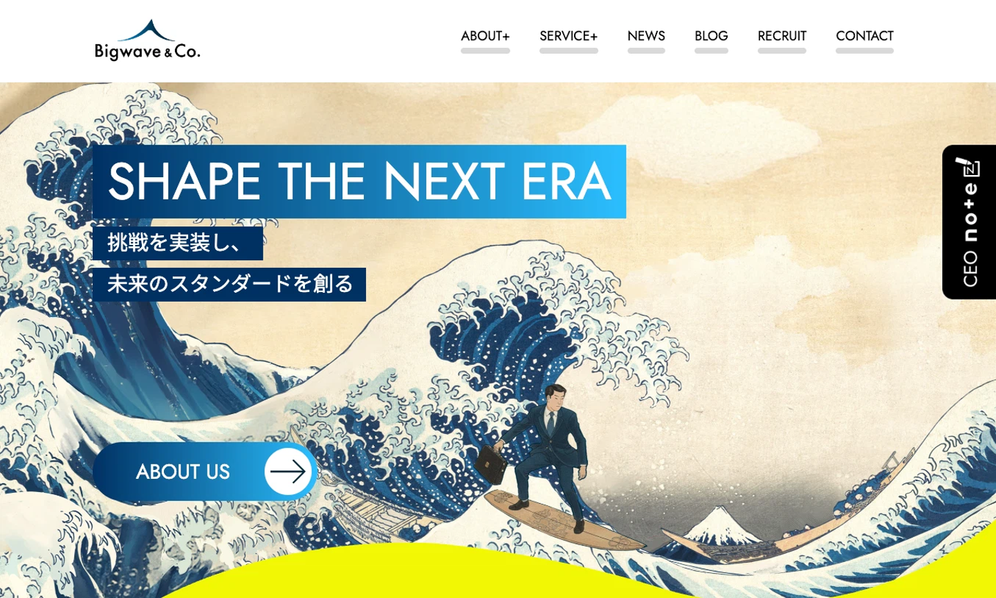 新しいサイトのトップには、葛飾北斎の大波が広がっています。ロゴには波と人の字が重なっています。そして社名の真ん中にあるのは、代表・大波周一が父から受け継いだ「大波」という姓です。