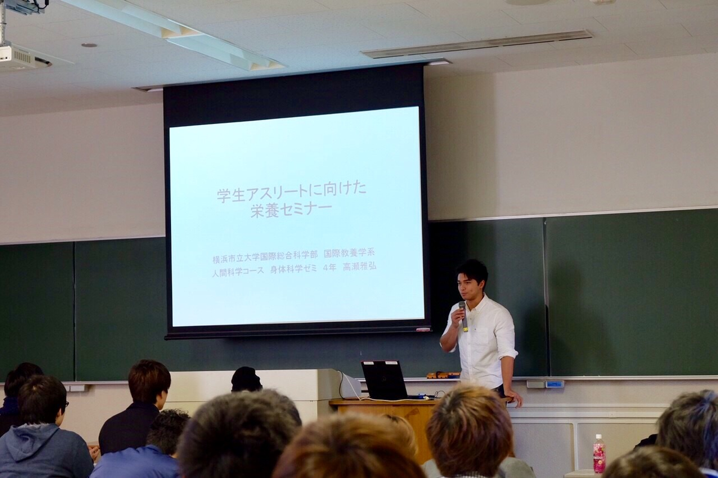 文転後、学問としての運動や栄養を学びそれらを自分の体に落とし込むのと並行して、大学内の学生に対して運動や栄養の講義を行う「キャプテントレーニング」の講師2年間連続専任していただきました。こちらのキャプテントレーニングの講義内容が評価されたのと、この講義後に市大運動部が神奈川リーグや日本大会等で優秀な成績を納めるようになり、その成績に貢献したということで「2015年度学長奨励賞」を受賞しました。