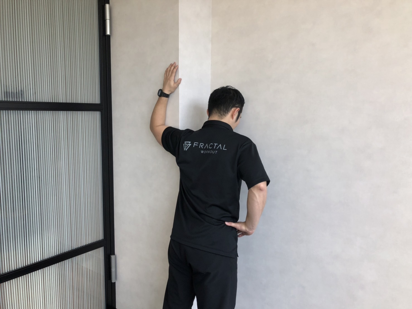 ②腕を壁につけたまま、胸を前に突き出すように伸ばす