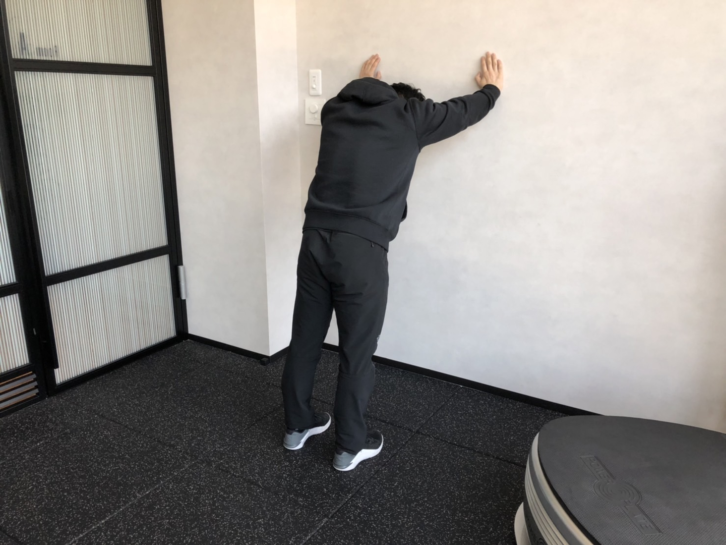 ・ゆっくりかかとを降ろし、床に着く寸前で降ろすのを止めてまた上げる