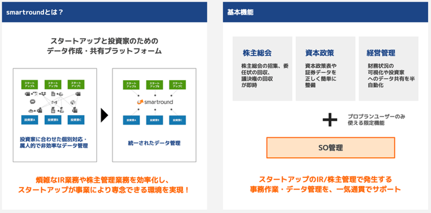 smartroundはスタートアップと投資家のためのデータ作成・共有プラットフォームです。スタートアップのIRや株主管理等に関わる業務を効率化し、スタートアップがより事業に専念できる環境の実現を目指しています。