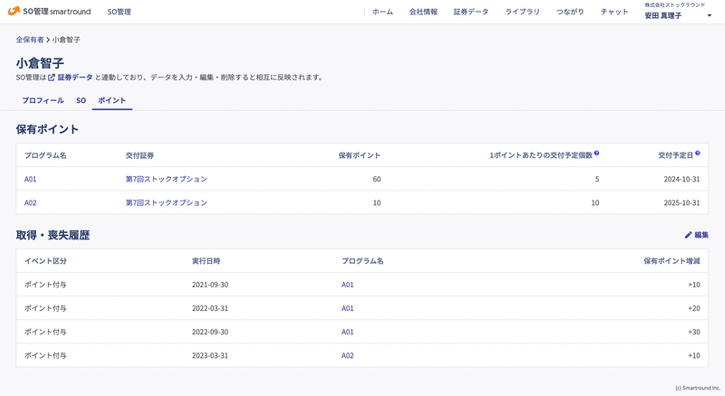また、従業員に付与するポイントの管理や、ポイント保有割合に応じたストックオプションの付与も可能です。