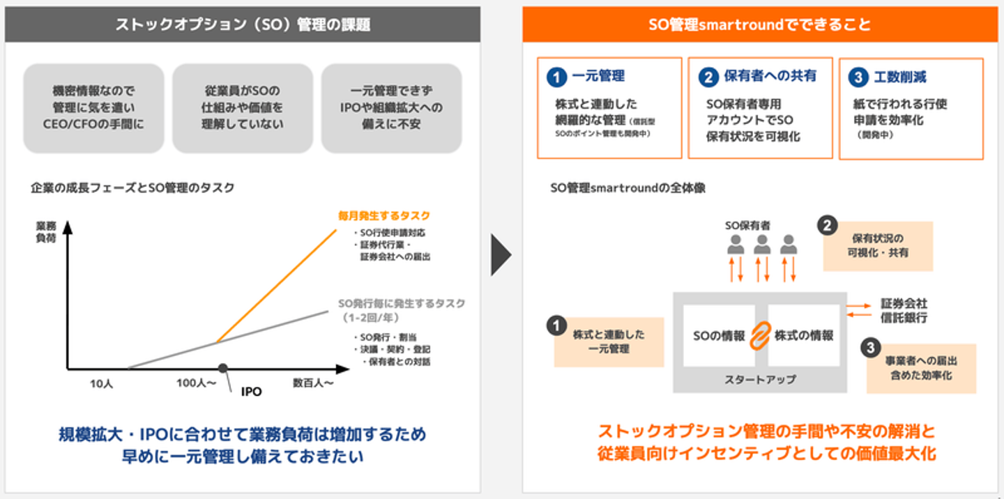 2022年6月1日にストックオプション管理サービス「SO管理smartround」をリリースしご好評をいただいておりましたが、2022年9月15日から従来型のストックオプションに加えて信託型ストックオプションの管理ができるようになりました。