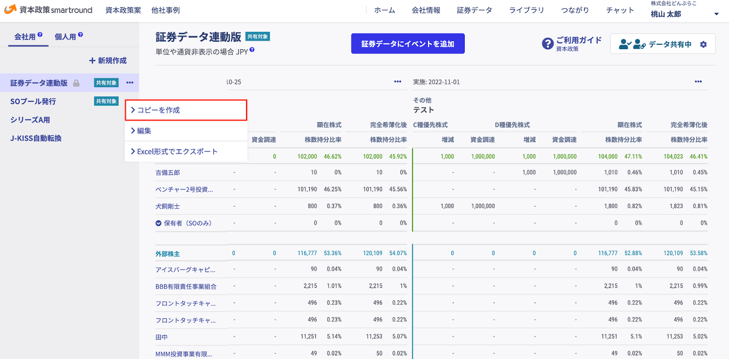 資本政策smartroundは実際の資本政策をコピーし、シミュレーションを何パターンにも分けて行うことができる。