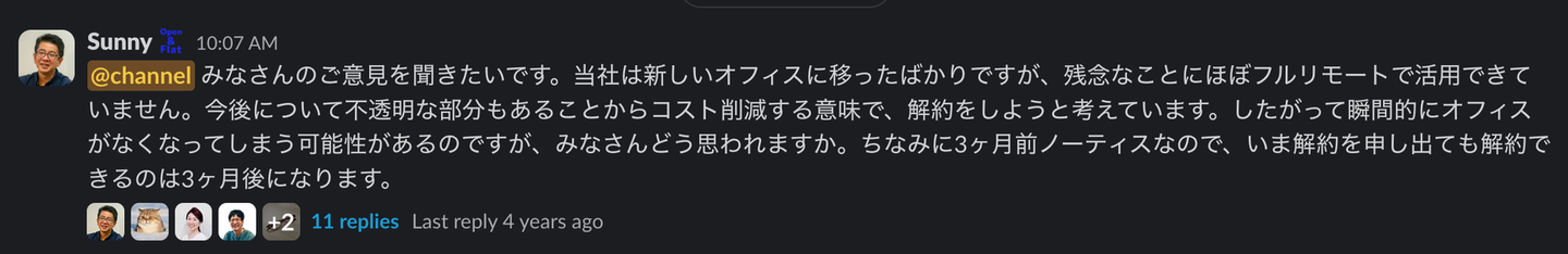 オフィス解約についてのサニーさん(編注:代表取締役の砂川)の当時の投稿。移転直後のタイミングということもあり、難しい判断だったと思います。