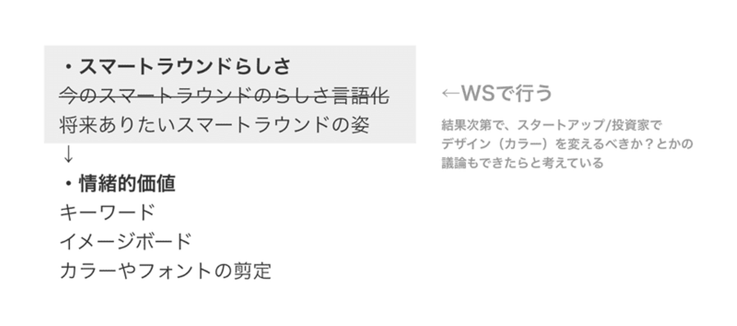 せなさん:そうなんですよ。今回のグロナビ刷新とは関係なくその課題はずっと感じていて、「smartroundにおける情緒的価値とは?」という部分を言語化したいと思ったんですよね。月一回社員全員が集まる場でsmartround全メンバーでワークショップを実施し、その結果を踏まえて、デザイナーとPdMが所属するプロダクト企画チームで整理しました。