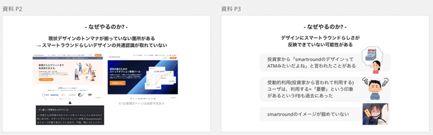 せなさん:入社してキャッチアップしていく中で、今までデザインの方針等が明確に言語化されていなかったこともあり、「smartroundらしいデザインとは何か」が自分の中でうまくイメージできないことに気づいたんですね。