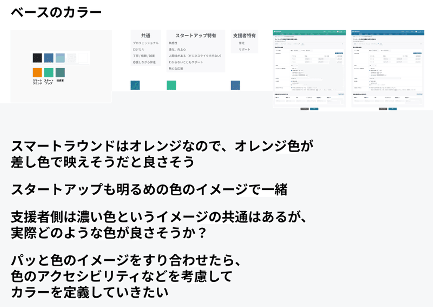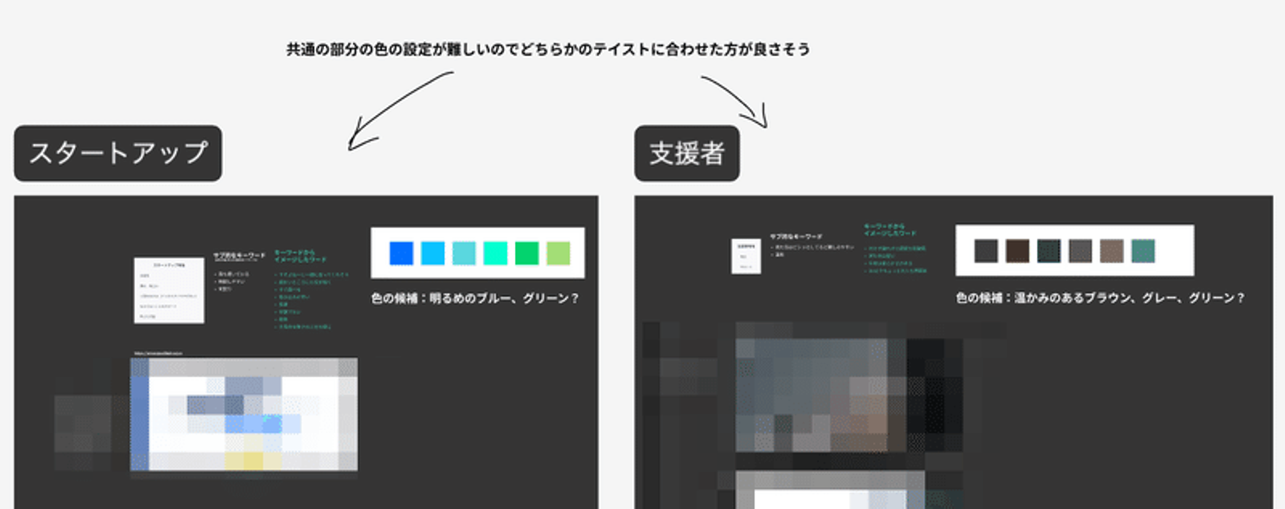 当初は「プロダクト全体のカラーまでちゃんとこだわって定義したい」と考えていたのですが、動画の納期を踏まえて「今回はスタートアップ・支援者特有のカラーだけ決めよう」とスコープを思い切って削りました。
